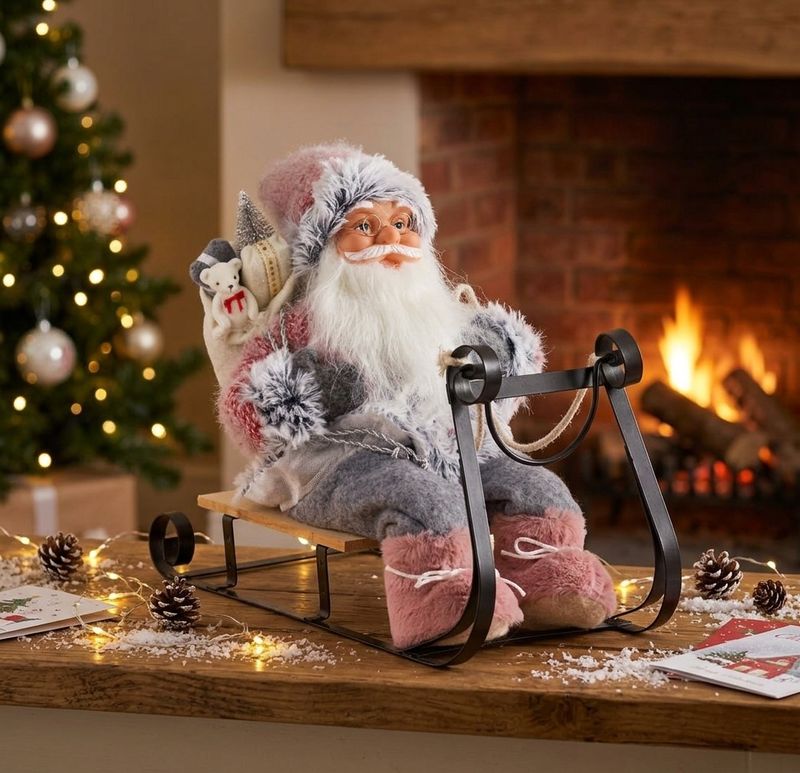 Adaugă un plus de farmec casei tale cu această decorațiune de Crăciun tip Moș Crăciun pe sanie, realizată în nuanțe elegante de roz și gri. Este o piesă decorativă potrivită pentru living, hol, birou sau spații comerciale, oferind un aspect festiv, cald și primitor în perioada sărbătorilor de iarnă.