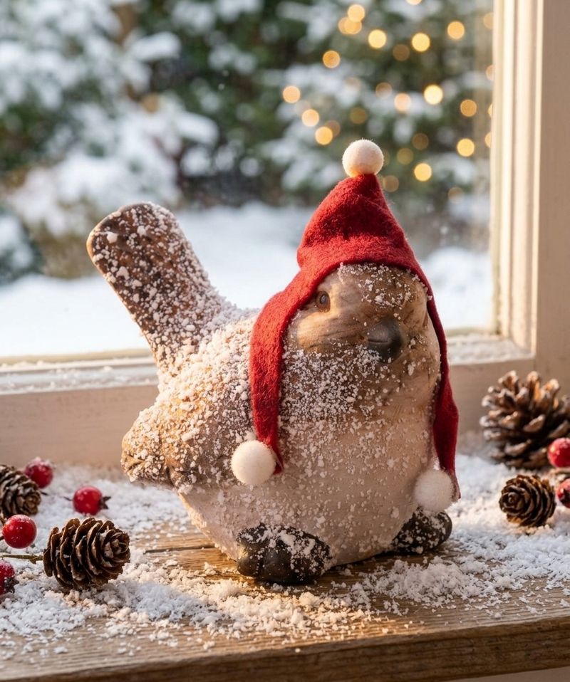 Adauga un plus de farmec sarbatorilor cu aceasta decoratiune de Craciun in forma de pasare cu caciula, realizata din teracota. Este o piesa decorativa simpatica, potrivita pentru a infrumuseta casa in sezonul festiv, fie ca o asezi pe raft, pe masa, pe pervaz sau intr-un aranjament tematic de iarna.