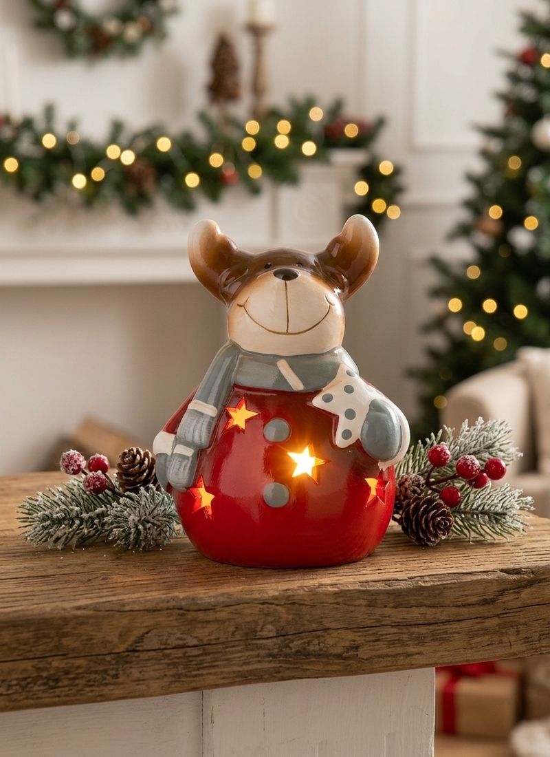 Adaugă un plus de farmec sărbătorilor cu această decorațiune de Crăciun cu ren realizată din teracotă, perfectă pentru a crea o atmosferă caldă și primitoare în locuință. Modelul vesel, cu ren zâmbitor și iluminare LED cu lumină alb cald, este ideal pentru decorarea rafturilor, meselor, pervazurilor sau colțurilor festive din casă.