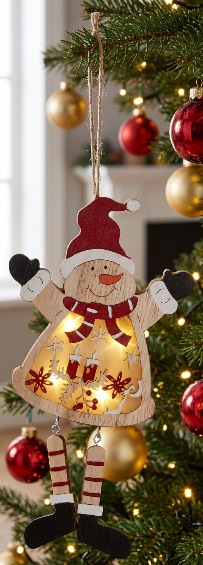 Adaugă un plus de farmec casei tale în sezonul festiv cu această decorațiune de Crăciun în formă de om de zăpadă. Realizată din MDF și prevăzută cu LED-uri cu lumină albă caldă, creează o atmosferă primitoare și veselă în orice încăpere. Designul suspendat și detaliile decorative o fac ideală pentru brad, perete, ușă sau alte colțuri ale casei.