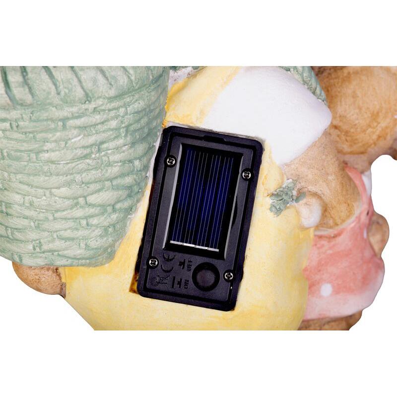- Un aspect important al acestei figurine este functia sa solara. Echipata cu un LED situat in interiorul oului din cos, se incarca in timpul zilei cu energie solara si se aprinde automat la lasarea serii, oferind o lumina ambientala placuta. Aceasta iluminare nu doar ca pune in valoare decoratiunea in sine, dar si creeaza o atmosfera calda si primitoare in gradina. Lumina discreta poate contribui la siguranta pe timp de noapte, marcand aleile sau treptele.