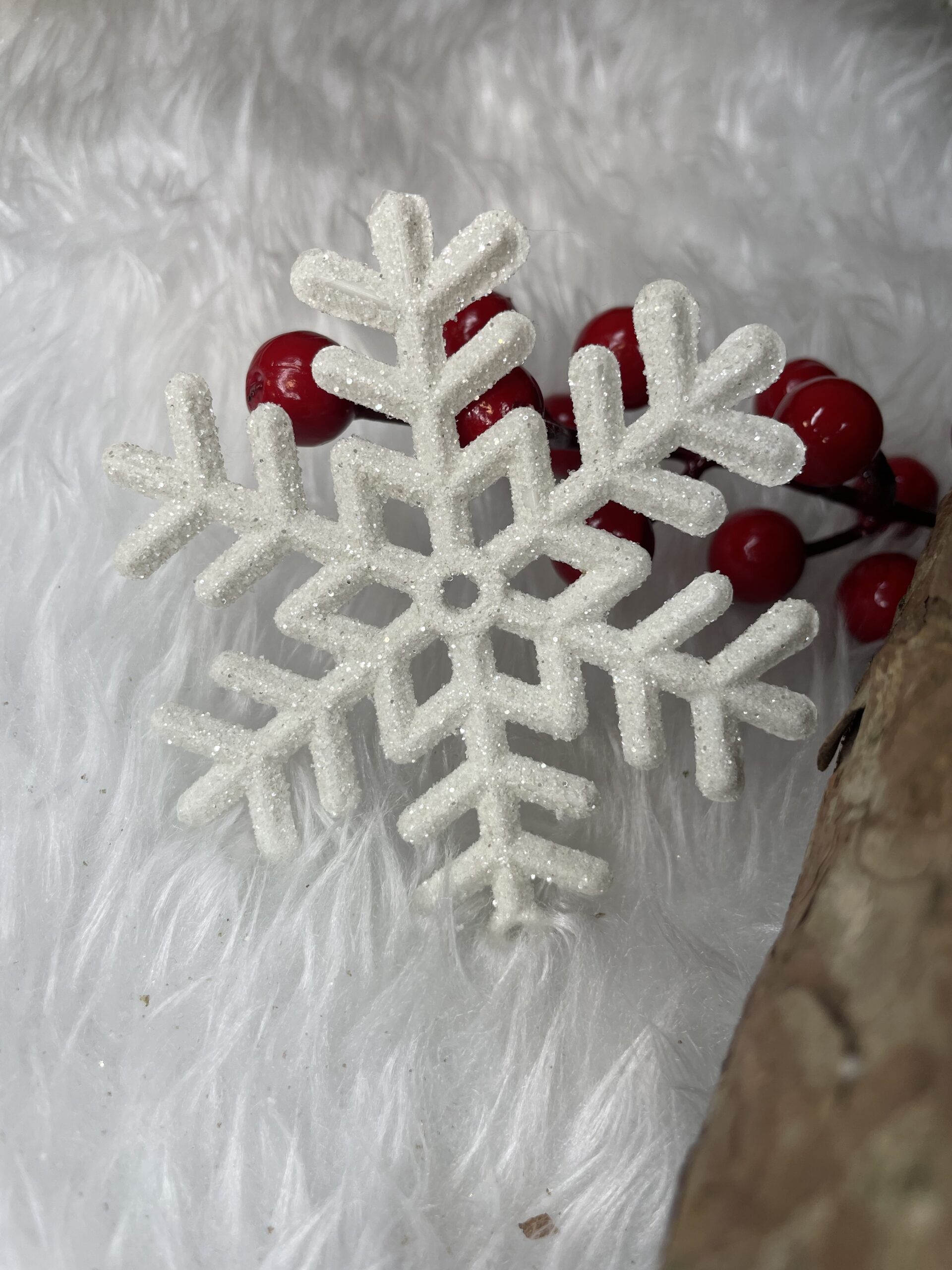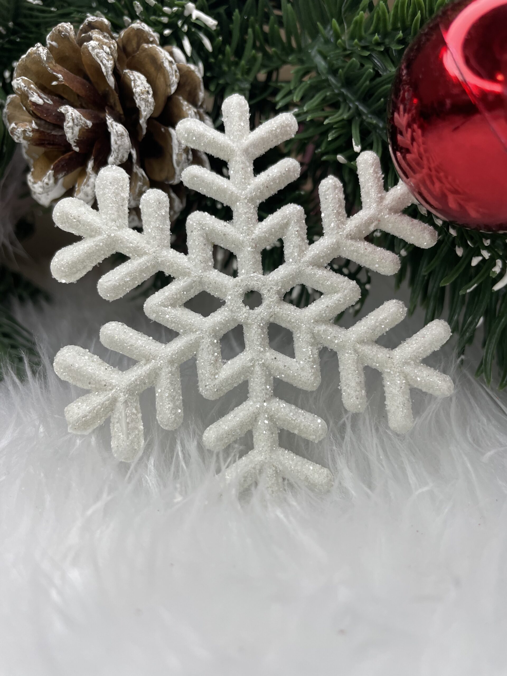 Adauga un plus de farmec sarbatorilor cu acest set de decoratiuni pentru brad in forma de fulg de zapada. Realizate din plastic rezistent, cu finisaj alb stralucitor si sclipici delicat, aceste ornamente creeaza un efect elegant si festiv in orice brad de Craciun. Sunt usoare, incasabile si potrivite pentru locuintele in care sunt copii sau animale de companie.