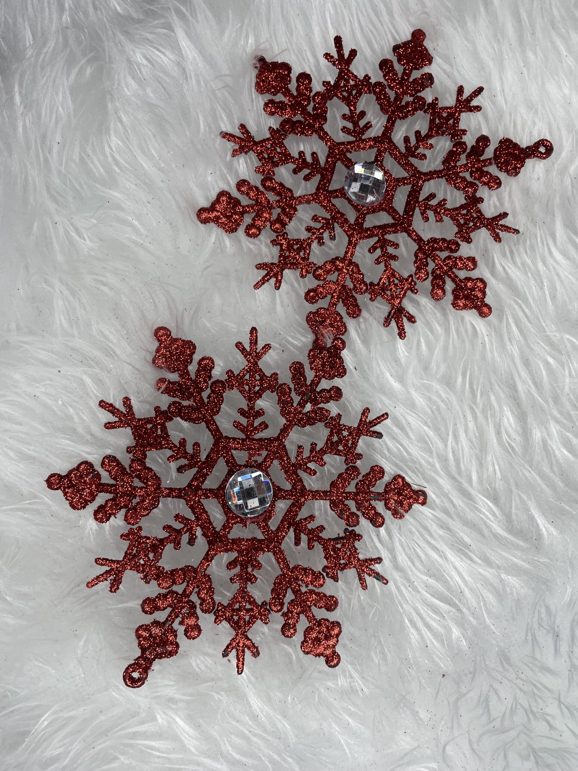 Adauga un plus de farmec sarbatorilor cu acest set de decoratiuni pentru brad in forma de fulg de zapada, intr-o nuanta eleganta de rosu. Fiecare ornament este decorat cu cristal transparent si finisaj cu sclipici, pentru un efect stralucitor si festiv in orice brad de Craciun. Realizate din plastic, aceste decoratiuni sunt usoare, rezistente si potrivite pentru casele cu copii sau animale de companie.