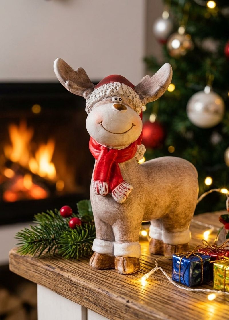 Modelul înfățișează un ren simpatic, cu fular roșu și căciulă asortată, fiind ideal pentru a completa un decor de Crăciun elegant, jucăuș și plin de personalitate. Poate fi așezată pe comodă, raft, masă festivă sau lângă brad.