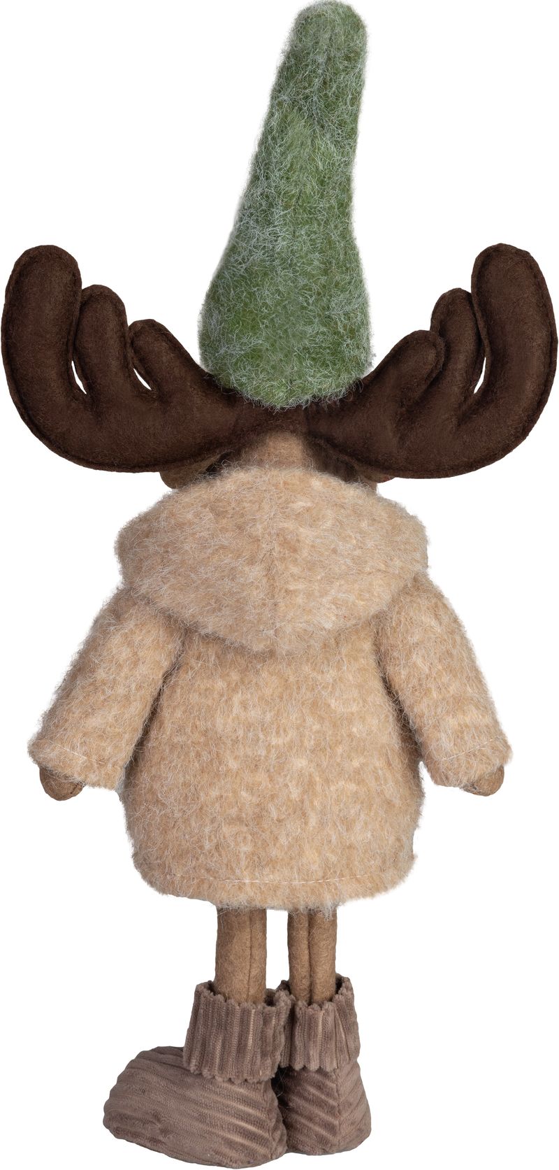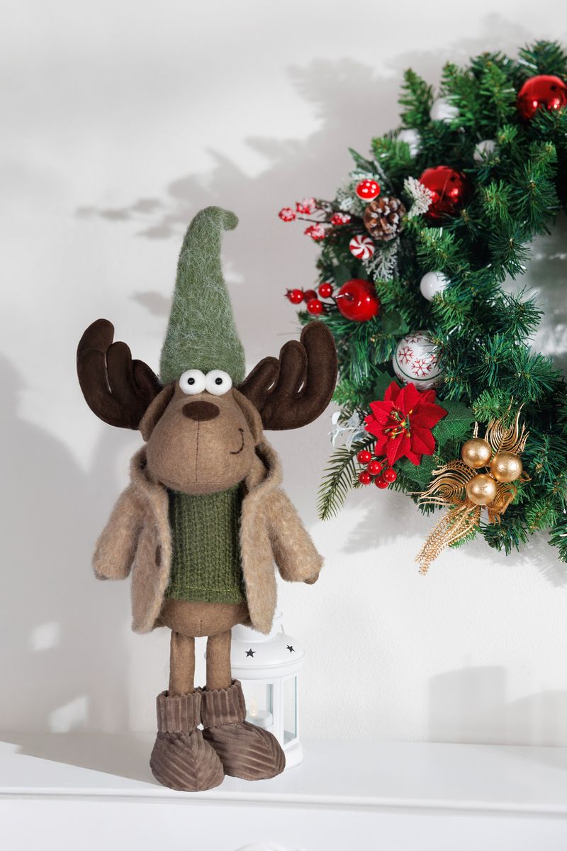 Modelul este îmbrăcat în nuanțe armonioase de verde și maro, cu pulover verde, haină pufoasă, coarne bine evidențiate și o căciulă înaltă care îi oferă un aspect simpatic și original. Este alegerea potrivită dacă îți dorești o decorațiune textilă de Crăciun care să creeze o atmosferă caldă și primitoare.