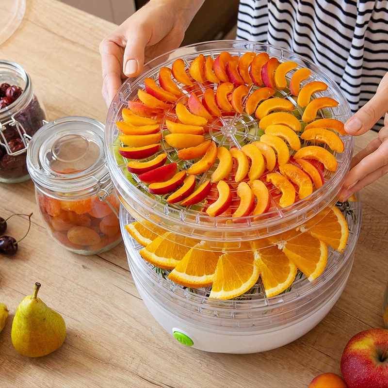 Are un ventilator încorporat în mijlocul corpului pentru a genera aer cald în sus și în lateral pentru a usca toate produsele alimentare uniform. Tot ce trebuie să faceți este să tăiați bunătățile selectate, să le așezați pe tavi de la unu la cinci etaje și să apăsați butonul de pornire! Tavile pot fi setate la o înălțime de uscare de până la 3 cm, în funcție de produsele alimentare selectate.