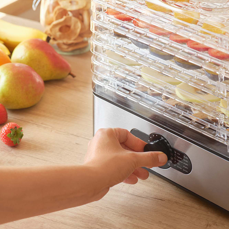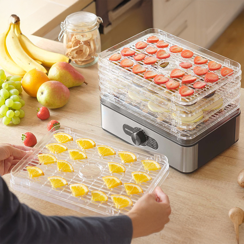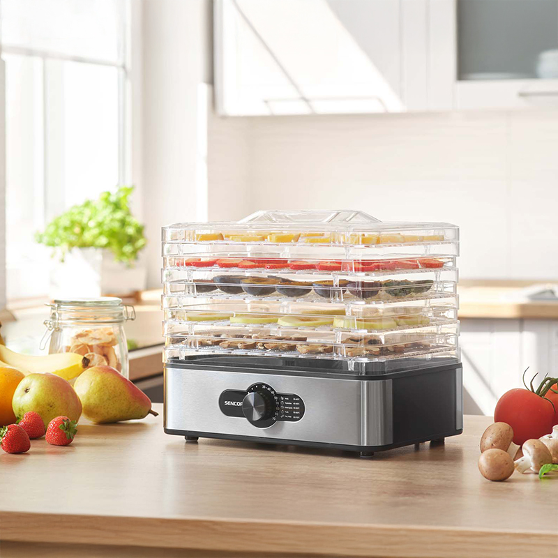 Pregătește acasă gustări naturale cu deshidratorul de alimente Sencor, ideal pentru fructe uscate, legume deshidratate, ierburi aromatice sau chiar carne și pește. Cu 5 tăvi transparente și temperatură reglabilă 35–70°C, obții o uscare uniformă, păstrând aroma și textura ingredientelor.
