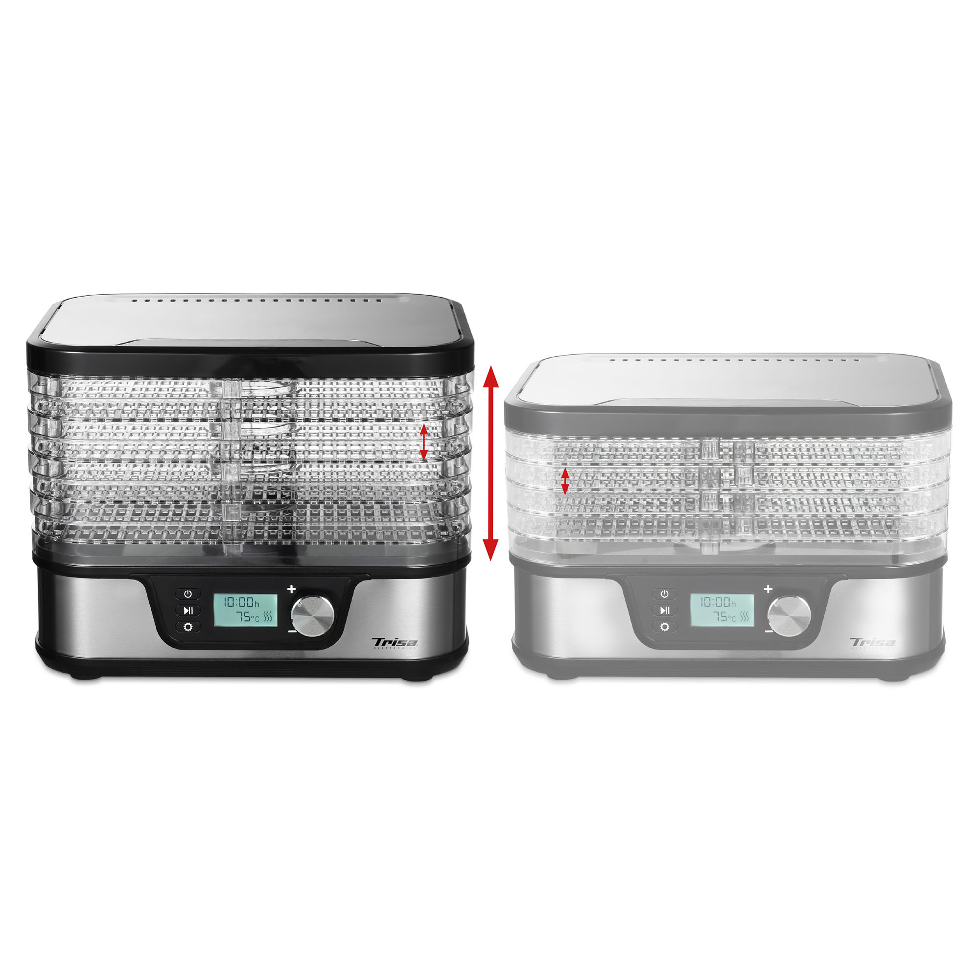 Ventilatorul cu aer circulant distribuie uniform căldura pe toate nivelurile, iar afișajul LCD face setarea timpului și temperaturii simplă și intuitivă. Cele 5 tăvi stivuibile oferă spațiu generos de uscare, cu înălțime reglabilă pentru alimente de dimensiuni diferite. În plus, plasa specială pentru ierburi îl face potrivit și pentru ingrediente fine.