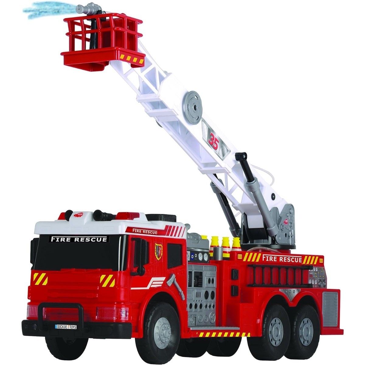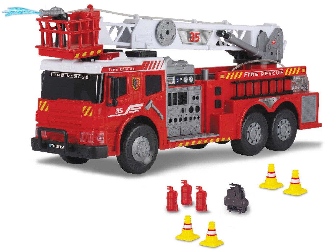 Masina de pompieri Dickie Toys, cu o lungime impresionanta de 62 cm, transforma joaca intr-o adevarata misiune de salvare. Copiii pot deveni pompieri curajosi, pregatiti sa intervina cu efecte luminoase si sonore realiste, care anunta sosirea ajutorului. Atractia principala este functia de pulverizare cu jet de apa prin stropitorul mobil, ce adauga un plus de realism si distractie. In plus, setul include accesorii precum stingatoare si piloni, pentru operatiuni de salvare si scenarii interactive. Realizata cu atentie la detalii, masina reda fidel designul unui vehicul real de pompieri. Functioneaza cu 2 baterii R6/AA de 1,5 V (incluse) si este recomandata copiilor de la 3 ani in sus.