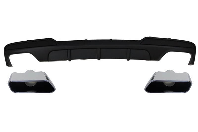 Difuzor aer dublu cu ornamente evacuare pentru BMW F10/F11 Seria 5, compatibil cu bara M-Sport / M-Tech. Ofera un aspect sportiv M-Performance 550i, este realizat din plastic rezistent si include ornamente din otel inoxidabil pentru un finisaj modern si elegant.