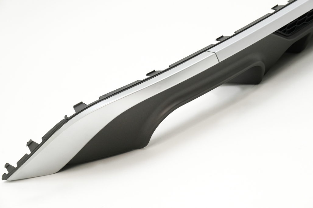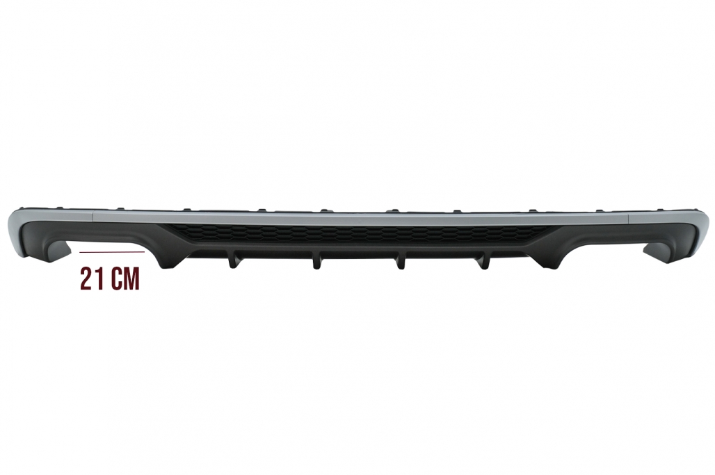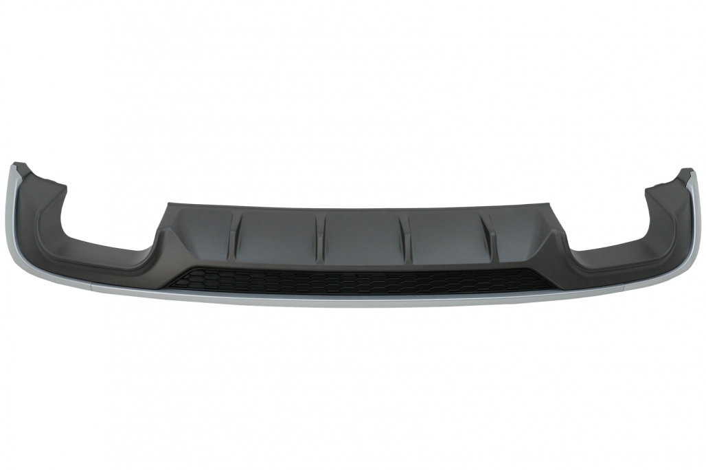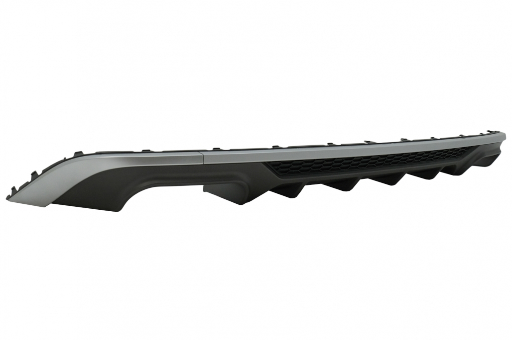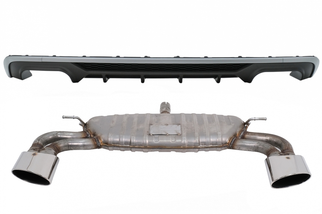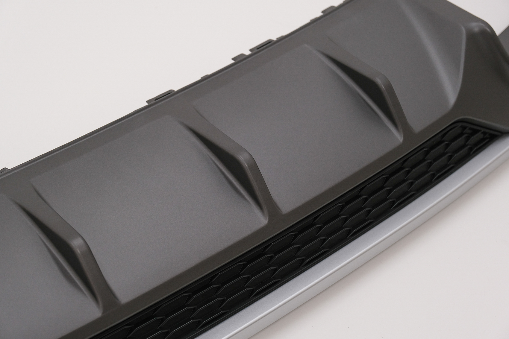 Difuzorul este fabricat din polipropilena de calitate, material apreciat pentru rezistenta si potrivirea buna pe caroserie, iar sistemul de evacuare este realizat din otel, cu ornamente finale din otel inoxidabil. Finisajul gri grafit cu insertii negre completeaza excelent designul spatelui si se integreaza armonios cu liniile originale ale masinii.