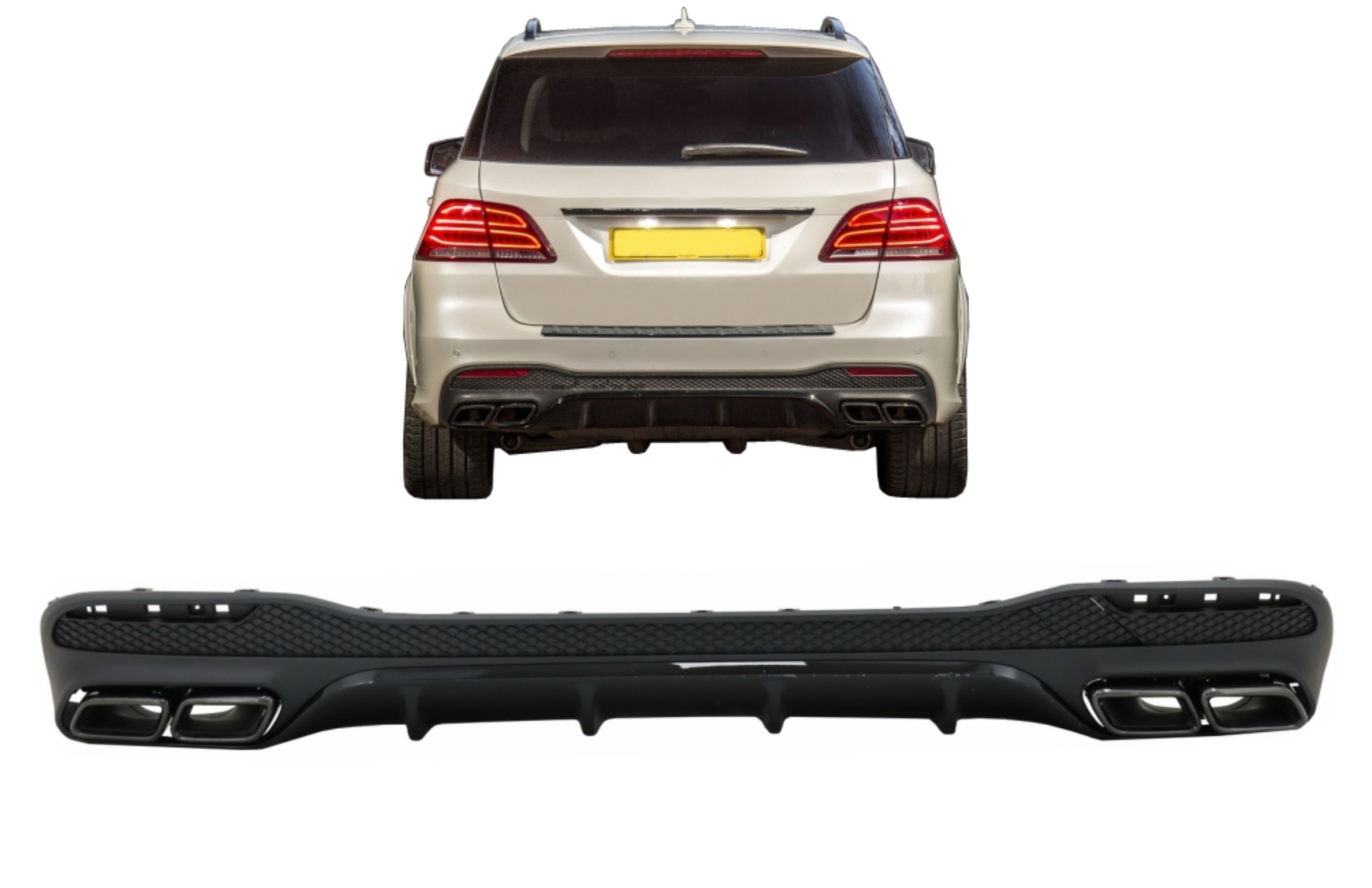 Acest difuzor spate Mercedes GLE W166 este compatibil cu modelele Mercedes GLE W166 SUV Sport Line (2015-2018) Night Package. Pentru montaj corect, țeava finală trebuie să intre în ornamentele difuzorului, iar gazele evacuate trebuie direcționate prin acestea, nu sub mașină. Pentru evitarea deteriorării, se recomandă instalarea într-un service auto autorizat. Instrucțiunile de montaj nu sunt incluse.