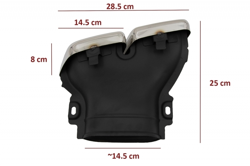 Produsul este realizat din polipropilenă, un material apreciat pentru rezistență și durabilitate, iar ornamentele de evacuare sunt fabricate din oțel inoxidabil 304 de calitate superioară. Se recomandă montajul într-un service auto autorizat, deoarece instrucțiunile de instalare nu sunt incluse.