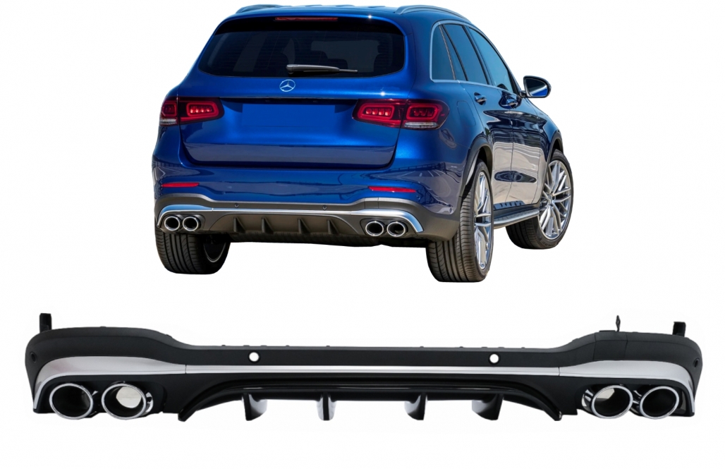 Pachetul contine difuzorul de bara spate si ornamentele de evacuare. Este o solutie excelenta daca vrei sa adaugi un plus de agresivitate si rafinament exteriorului modelului tau Mercedes GLC.