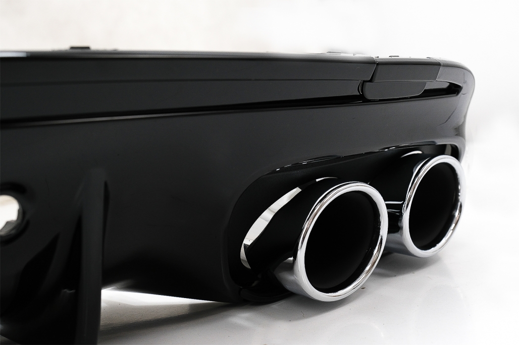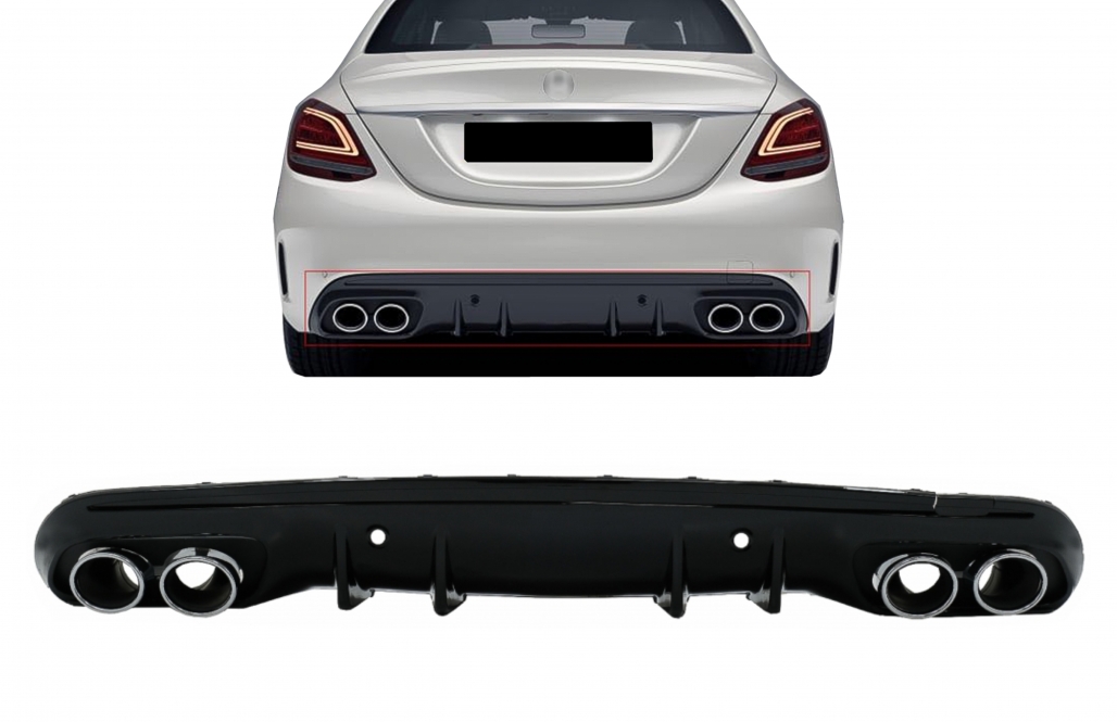 Acest difuzor bara spate Mercedes C-Class este destinat înlocuirii sau upgradrului estetic al elementului existent. Pentru montaj corect, țeava finală trebuie să intre în ornamentele de evacuare, iar gazele trebuie evacuate prin acestea, nu sub mașină. La modelele Diesel Bluetec cu AdBlue poate fi necesară modificarea unei țevi de evacuare pentru potrivire. Instrucțiunile de instalare nu sunt incluse, iar montajul într-un service auto autorizat este recomandat.