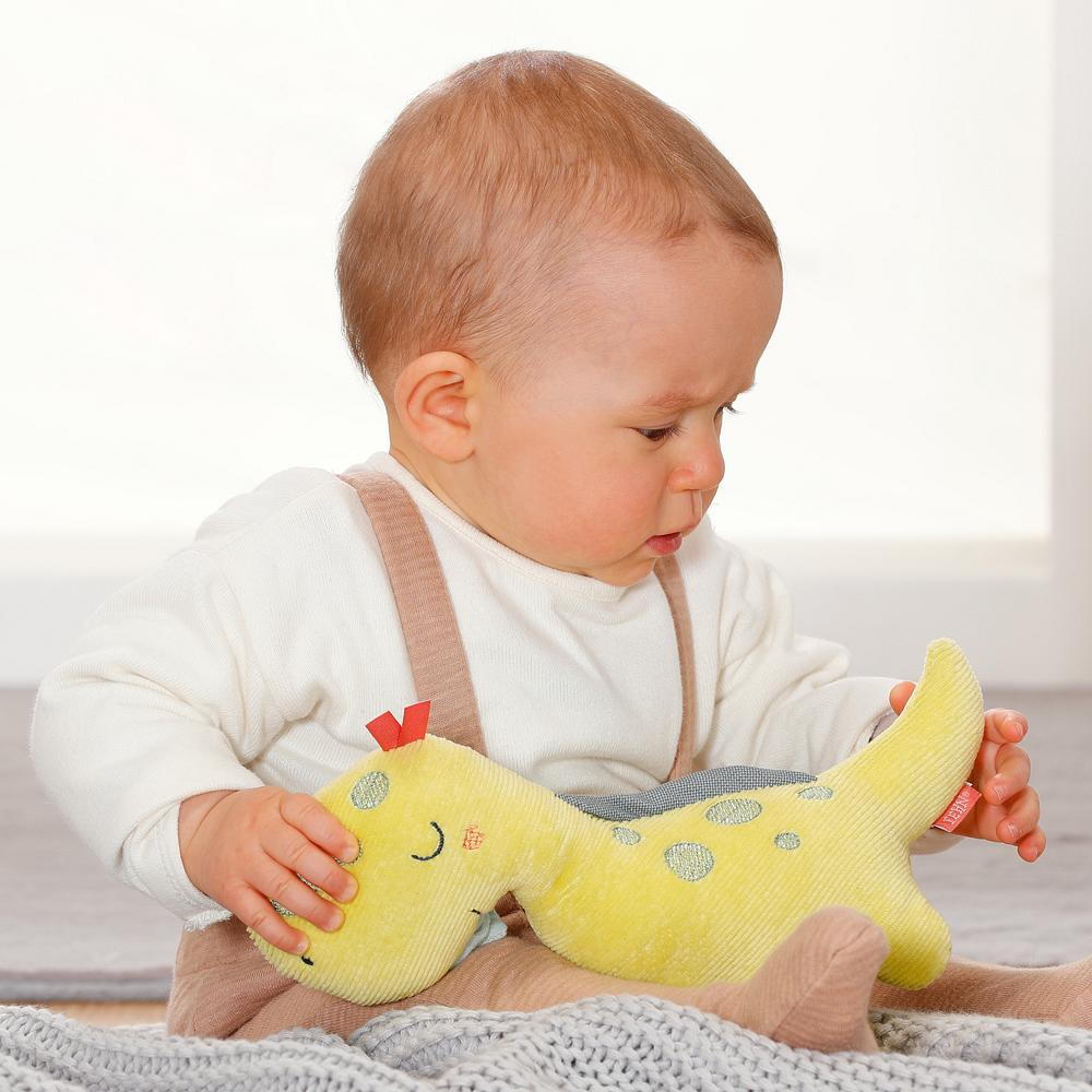 Ofera-i micutului tau un companion bland pentru nopti mai linistite cu acest dinozaur cu lampa de veghe pentru bebelusi. Realizat din materiale moi si placute la atingere, acest plus adorabil combina rolul de jucarie de patut cu cel de lampa de noapte, ajutand copilul sa se relaxeze mai usor la culcare. Culorile delicate, designul prietenos si efectele luminoase contribuie la o atmosfera calmanta si placuta in camera copilului.