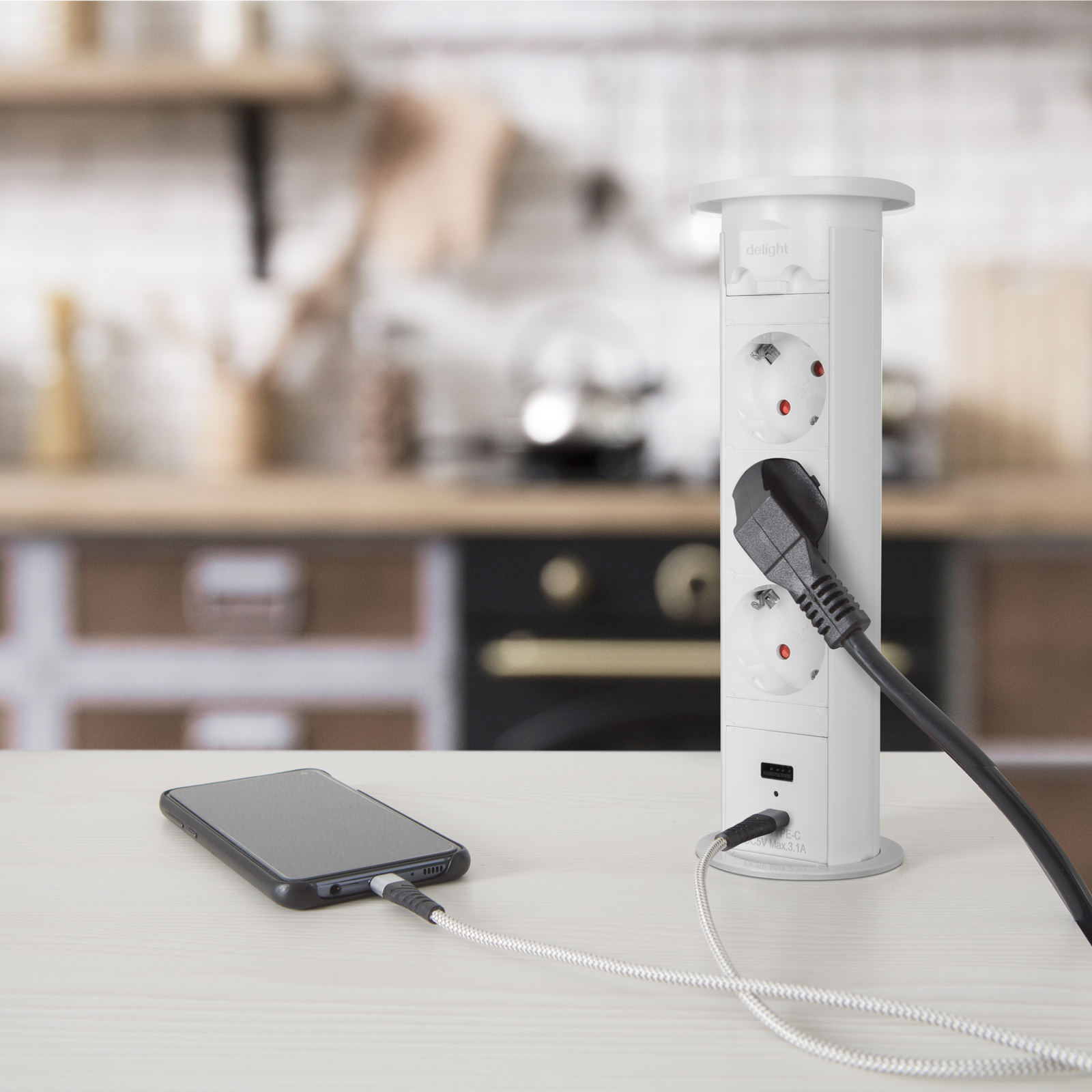 Distribuitorul are 3 prize cu protectie pentru copii și o unitate de încărcare USB dublă.