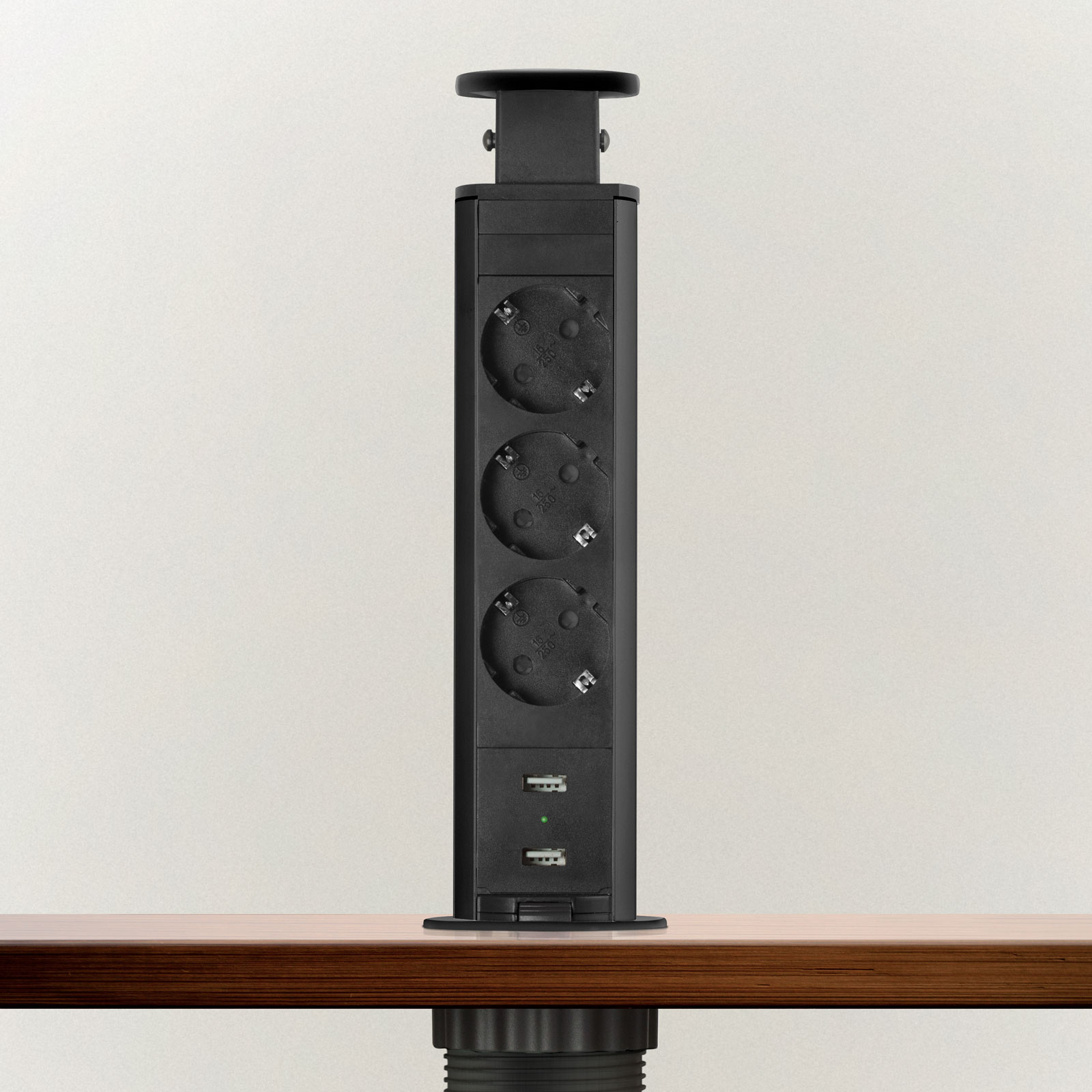 Distribuitor pop-up cu carcasă metalică și 3 prize de protecție pentru copii și 2 prize USB pentru birouri și case.