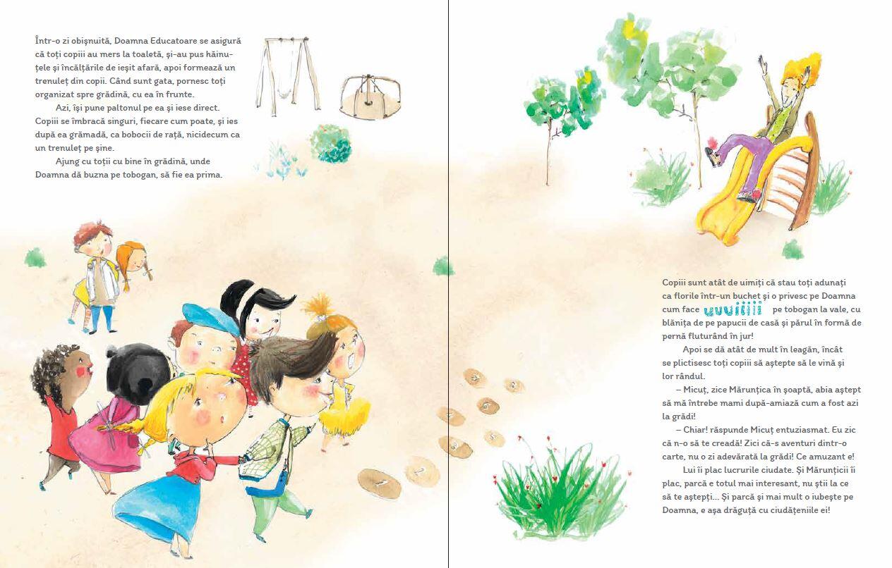 În această carte ilustrată pentru grădiniță, doamna educatoare, de obicei calmă și organizată, începe să se poarte complet neobișnuit: vine în pijamale, uită de reguli și transformă ziua într-o aventură amuzantă. Lectura este ideală pentru momentele petrecute în familie, dar și pentru discuții despre emoții, comportament și relația copil-educator.