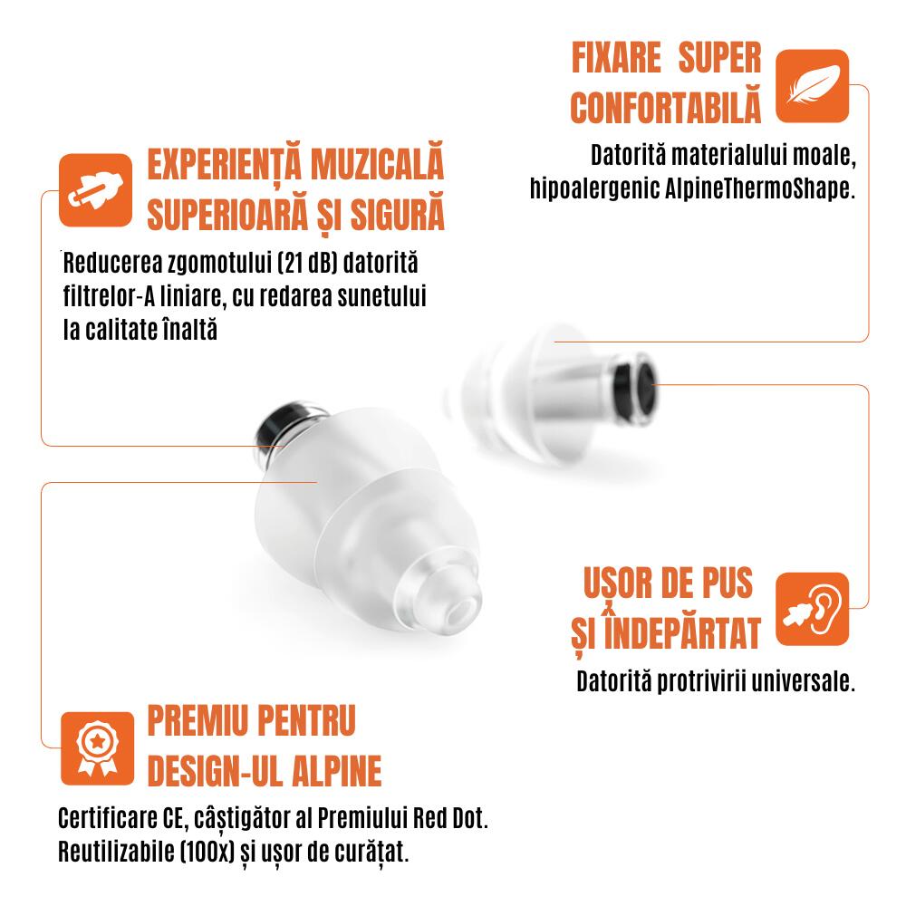 Lumea devine din ce in ce mai zgomotasa. Cand mergeti un concert sau un festival, doriti sa va puteti bucura de muzica fara a suferi pierderea auzului. Dopurile de urechi Alpine PartyPlug PRO va permit sa va bucurati de muzica in timp ce va protejati impotriva tinitusului, acel zgomot enervant in urechi. Ele sunt concepute special pentru a reduce volumul muzicii la niveluri sigure, asigurand o atenuare foarte naturala a sunetului si permitandu-va in acelasi timp sa va bucurati de o calitate ridicata a sunetului si de comunicare cu prietenii.