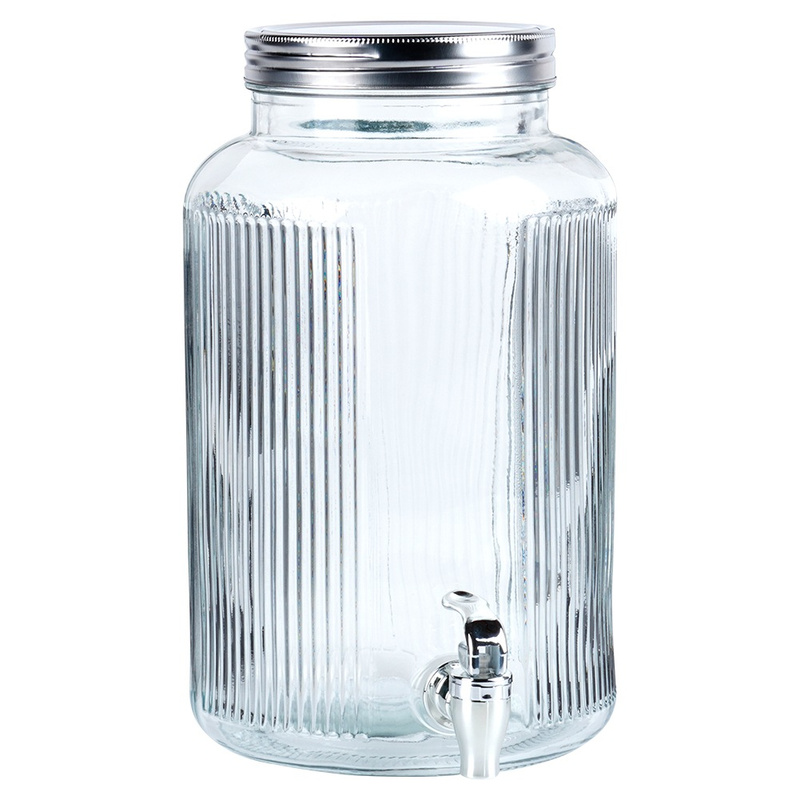 Transformă orice masă într-un colț de răcorire cu acest dozator de băuturi din sticlă de 6,2 L, cu robinet, perfect pentru limonadă, ceai rece sau apă aromatizată. Designul striat arată excelent pe bufet, iar sticla groasă păstrează băutura la vedere, într-un mod elegant și practic.