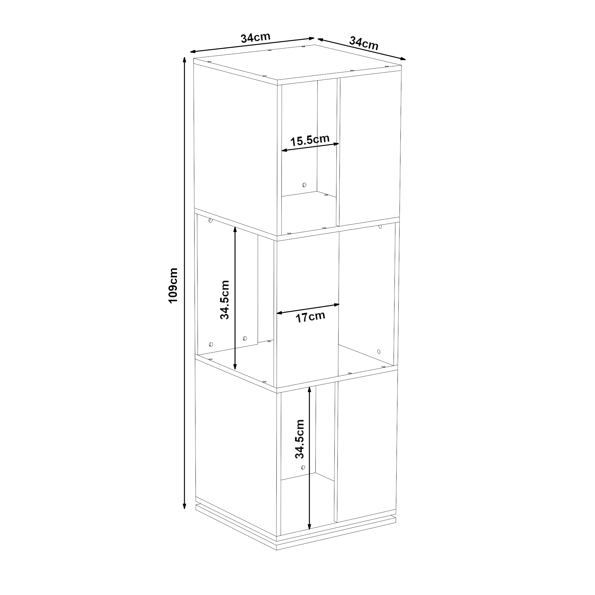 Das drehbare Kinderregal verfügt über drei großzügige, offene Ablagefächer, die ausreichend Platz für Bücher, Spielsachen oder Deko bieten. Die halbgeschlossenen Seiten verleihen ihm eine stilvolle und harmonische Optik.