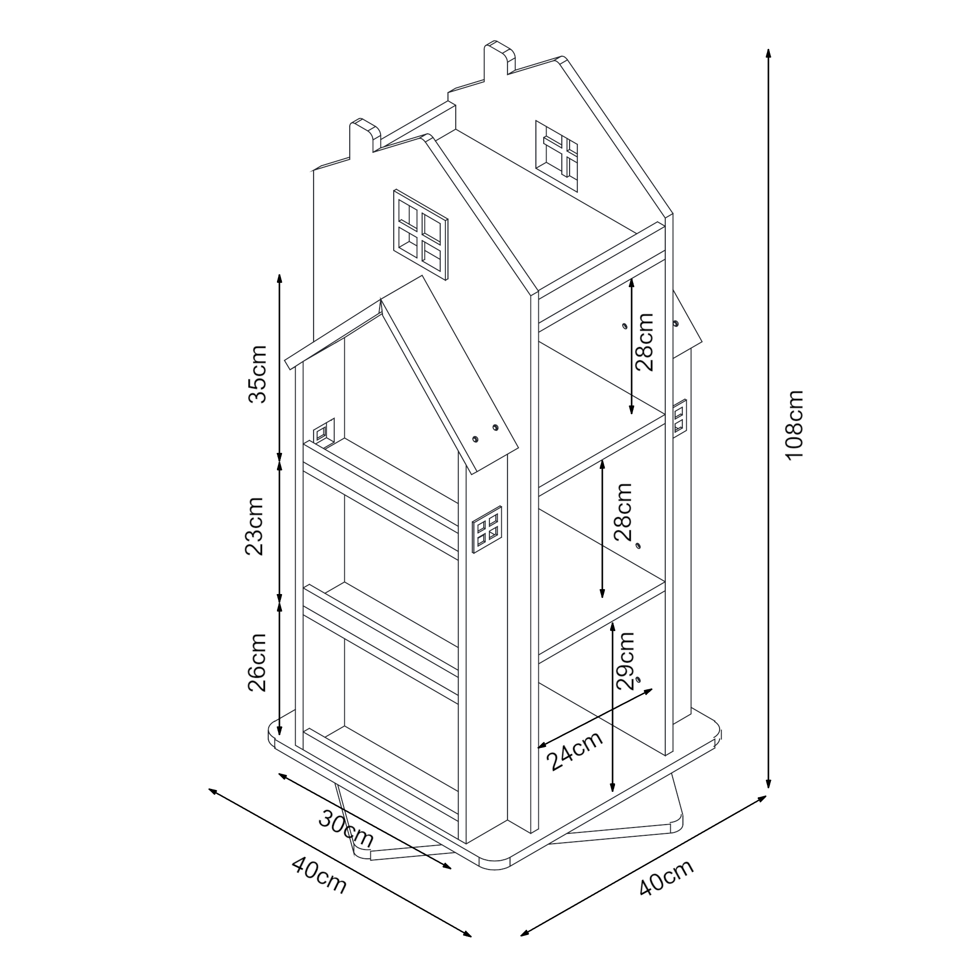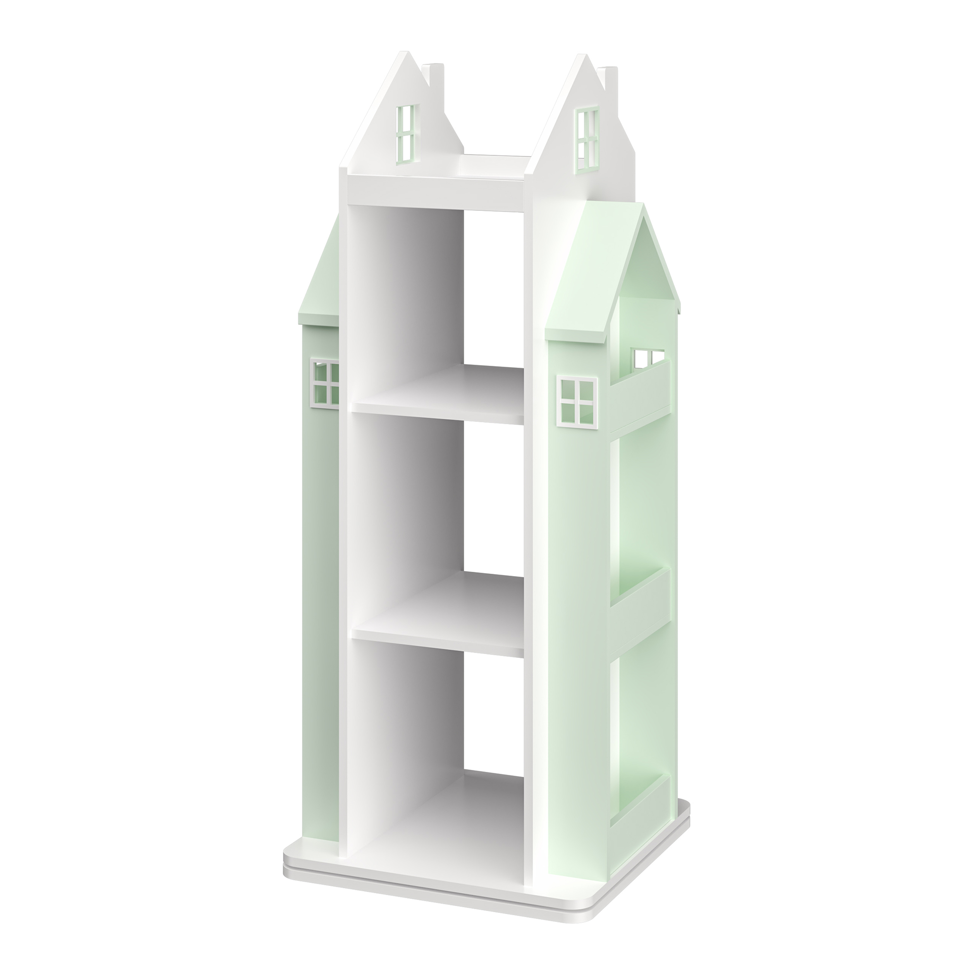 Das drehbare Kinderregal bietet mit drei offenen Ablagefächern in der Mitte und jeweils drei Fächern an den Seiten reichlich Platz für die Schätze Ihres Kindes. Die dekorative Hausoptik macht es zu einem echten Hingucker in jedem Kinderzimmer.