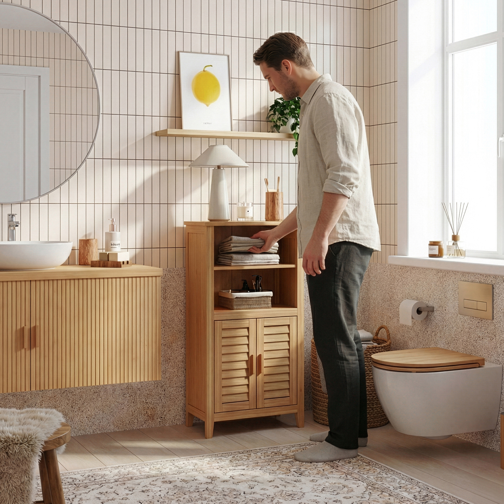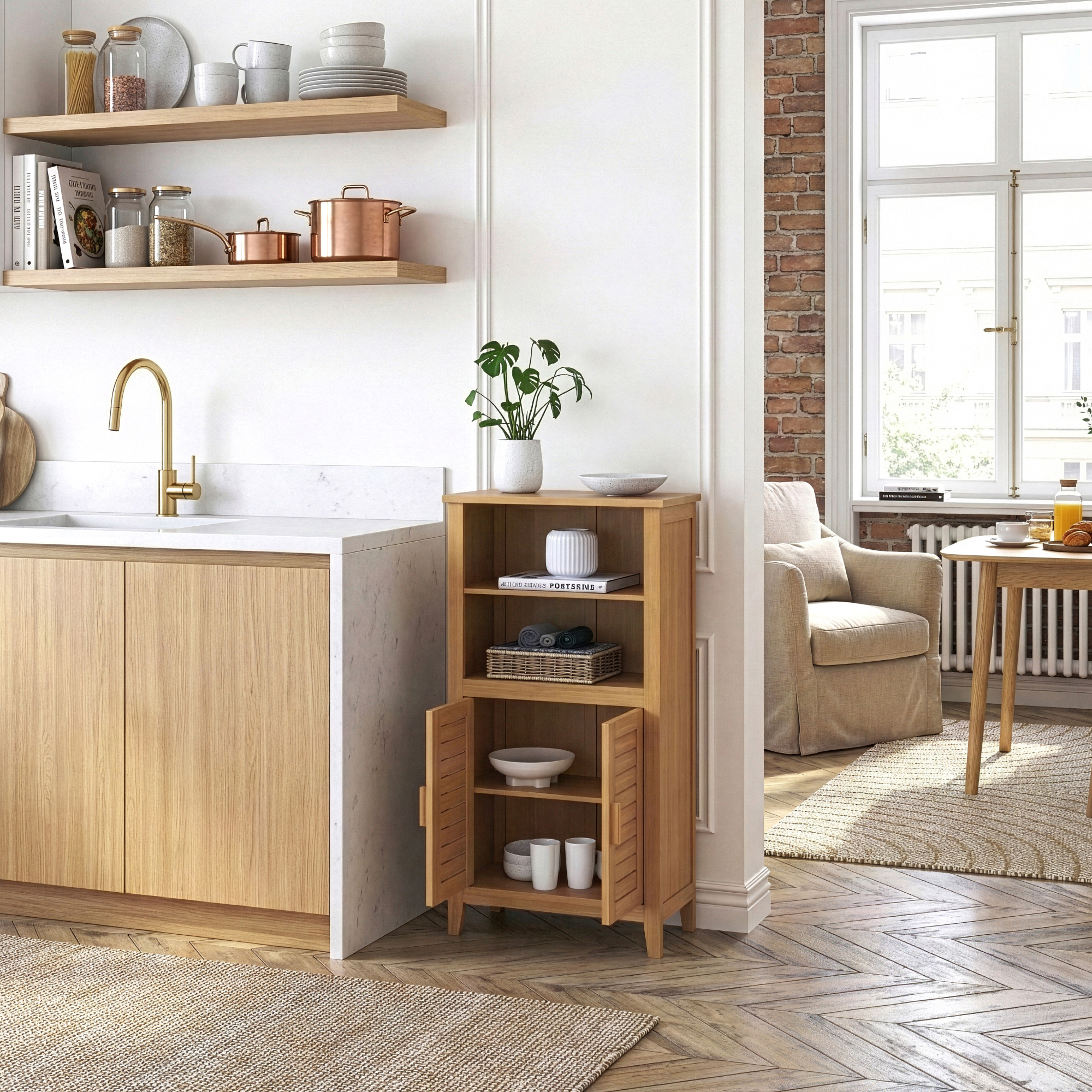 Dulapul auxiliar din bambus Rirg este o soluție practică și elegantă pentru organizarea eficientă a casei. Cu un design modern, finisaj natur și format compact, acest dulap de depozitare se potrivește excelent în baie, hol, bucătărie sau alte zone de locuit.