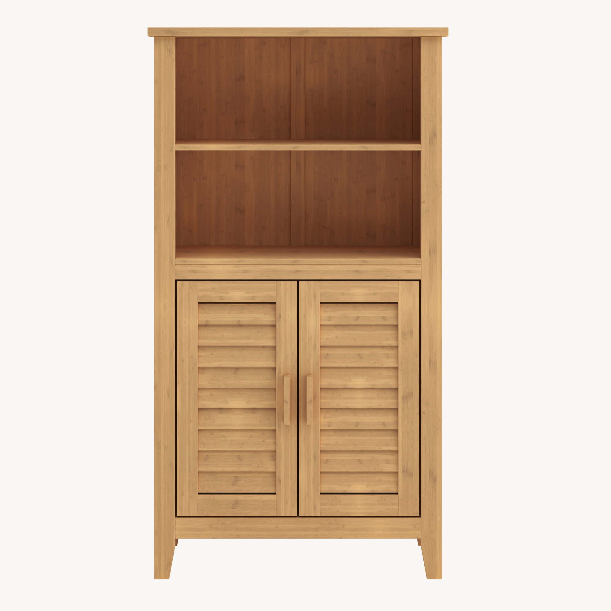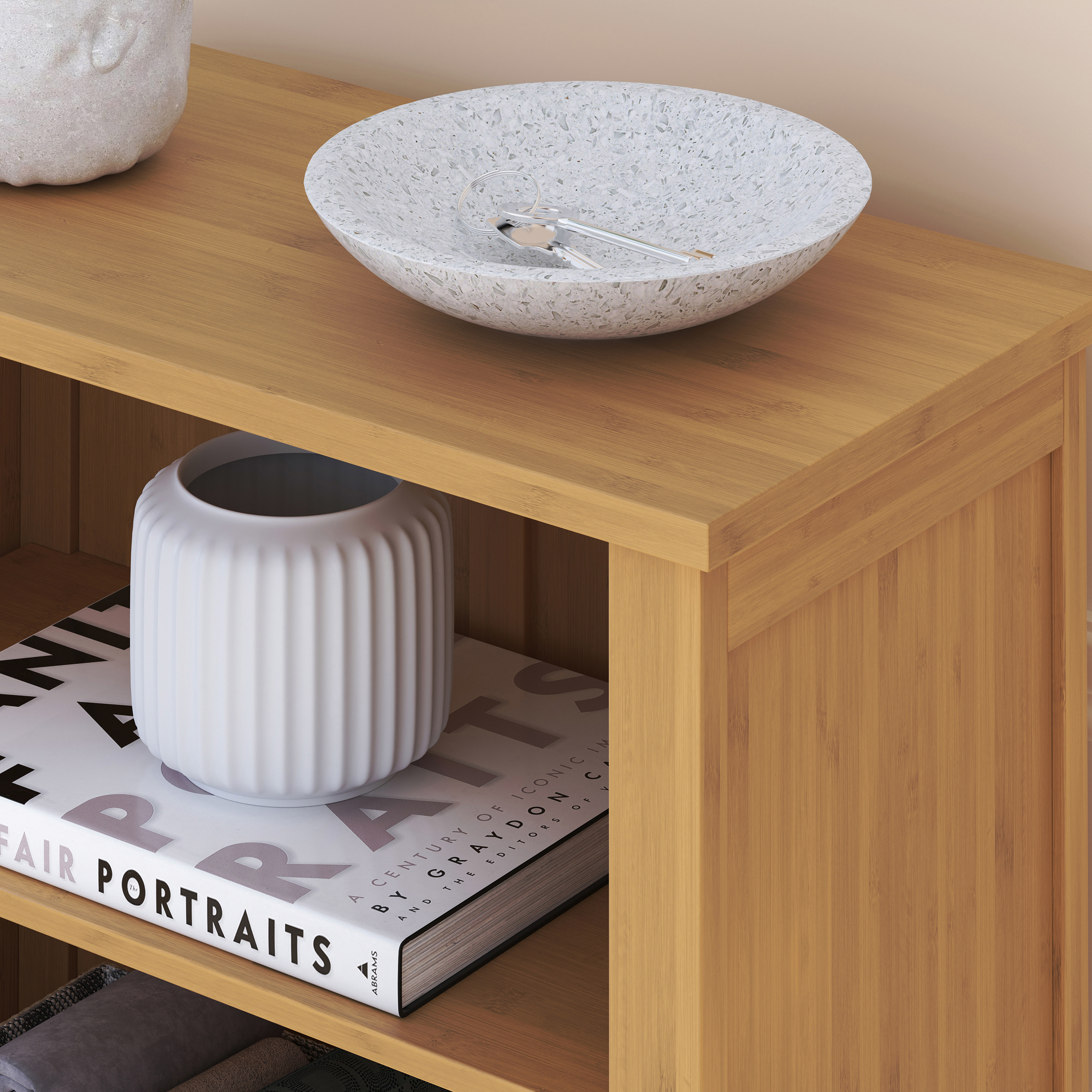 Partea superioară include două compartimente deschise, ideale pentru obiectele pe care vrei să le ai la îndemână sau pentru decor. În partea de jos, cele două uși ascund rafturi interioare utile pentru o depozitare ordonată și protejată. Datorită materialului din bambus rezistent la umiditate, este foarte potrivit și ca dulap baie.