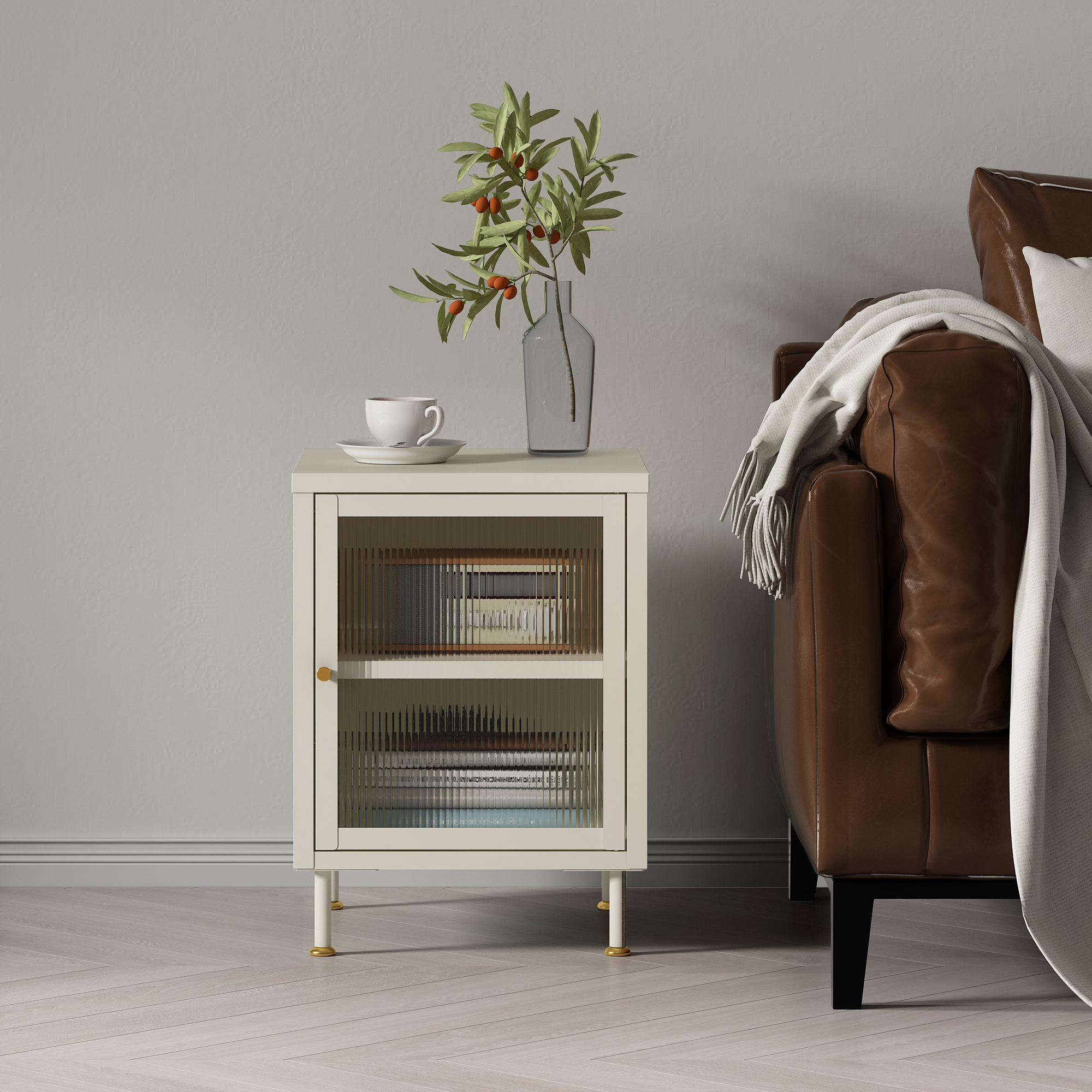 Dulap auxiliar Lindau crem cu ușă din sticlă striată, 56x40x40 cm