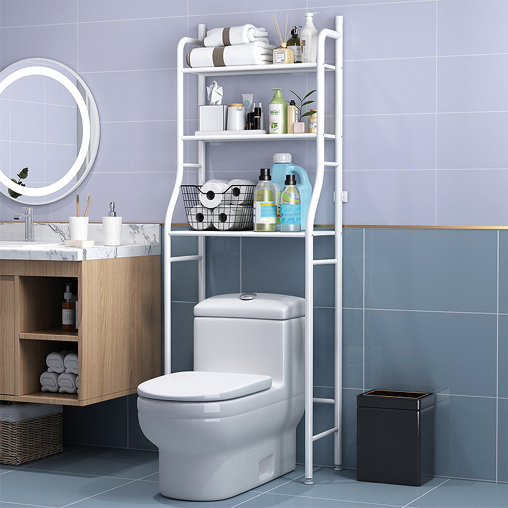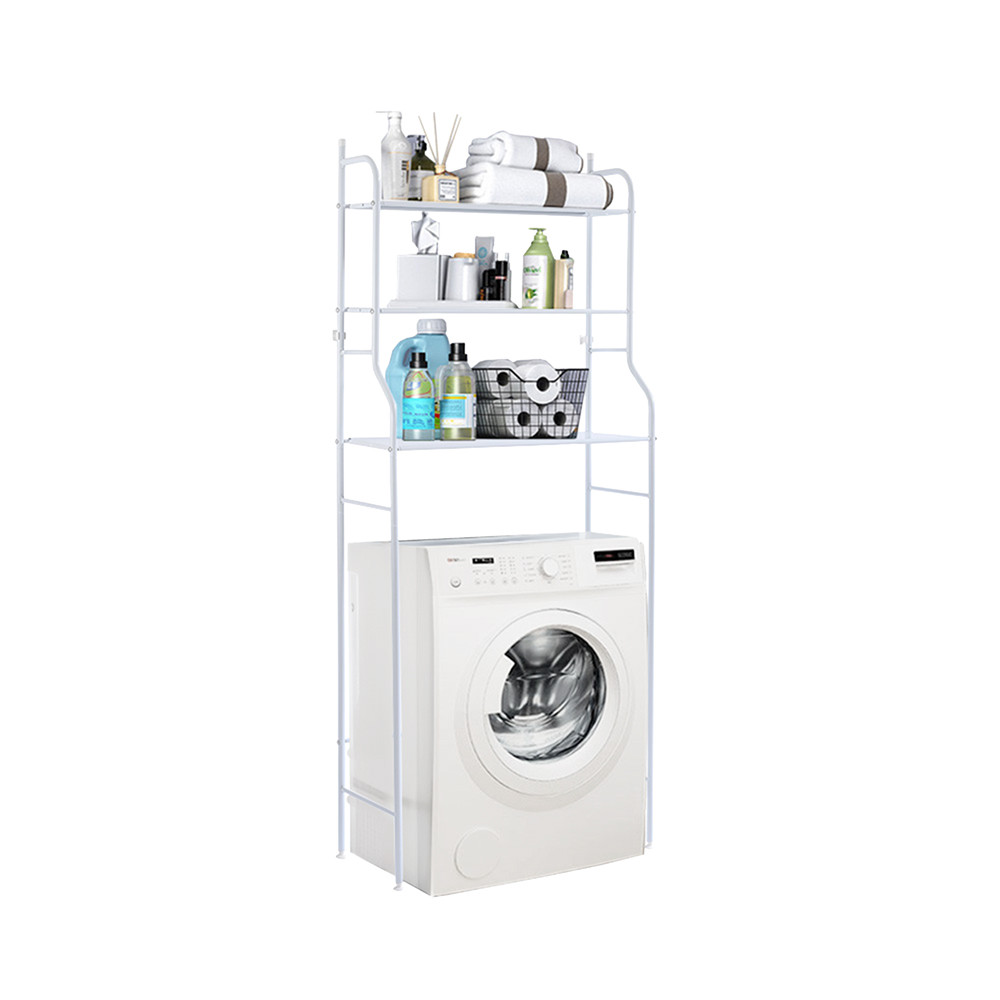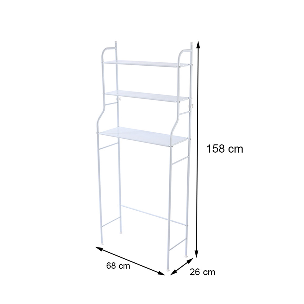 Utilizare: montează structura în jurul mașinii de spălat, apoi distribuie greutatea pe cele 3 polițe (produsele mai grele jos). Pentru siguranță, fixează suportul de perete cu elementele incluse, mai ales în băi înguste sau spații intens folosite.