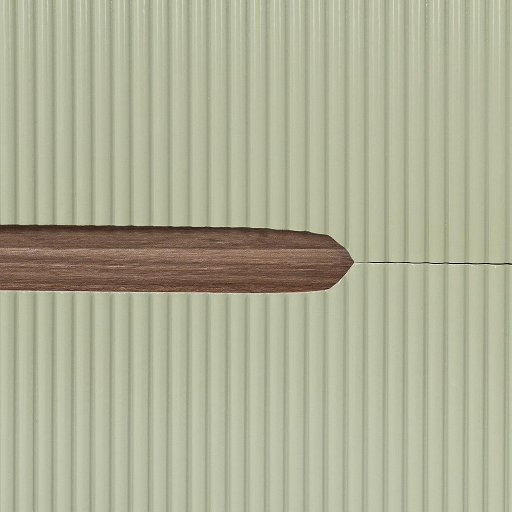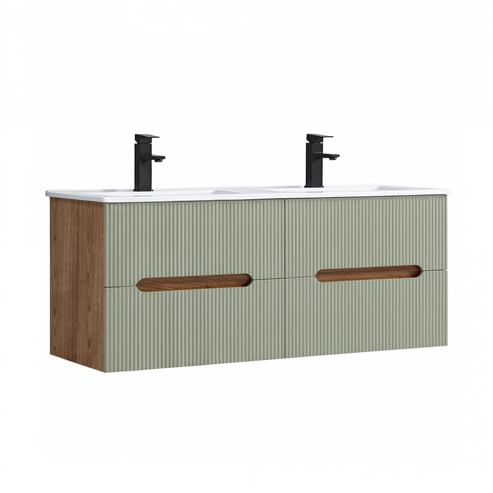 Dulapul de baie Leziter Trent 120 cm îți aduce un look modern și ordonat, combinând elegant finisajul tip stejar apus de soare cu frontul verde olive canelat. Montajul suspendat lasă podeaua liberă, astfel încât curățenia devine mai rapidă, iar baia capătă un aer aerisit. În plus, chiuveta din ceramică albă este rezistentă la uzură și ușor de întreținut zilnic.
