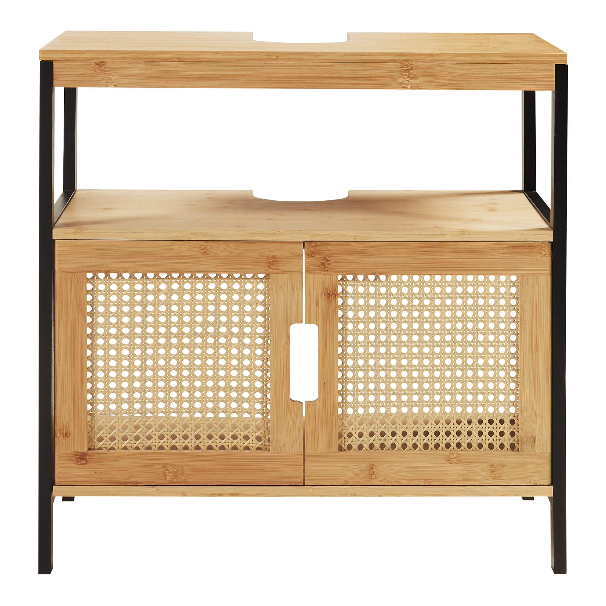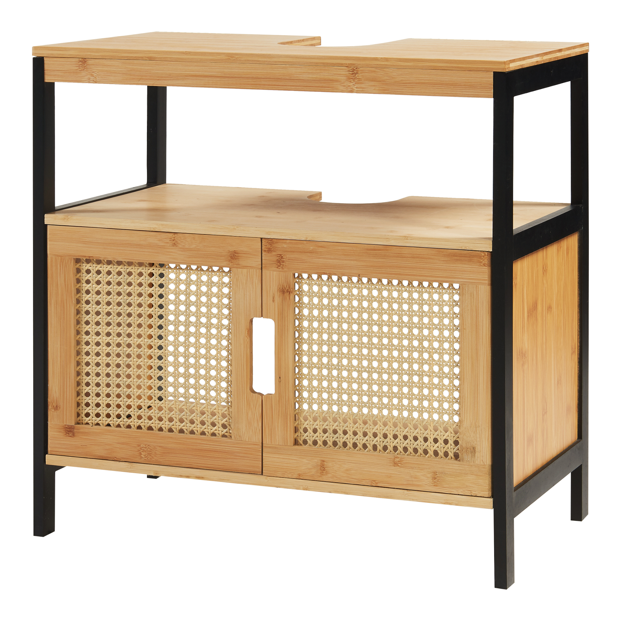 Dulapul de baie sub chiuvetă Tervola este soluția ideală pentru a organiza elegant spațiul din baie și pentru a obține loc suplimentar de depozitare. Cu un design modern, în combinație de negru și bambus natural, acest dulap sub lavoar se integrează ușor în amenajări contemporane, naturale sau tip spa.