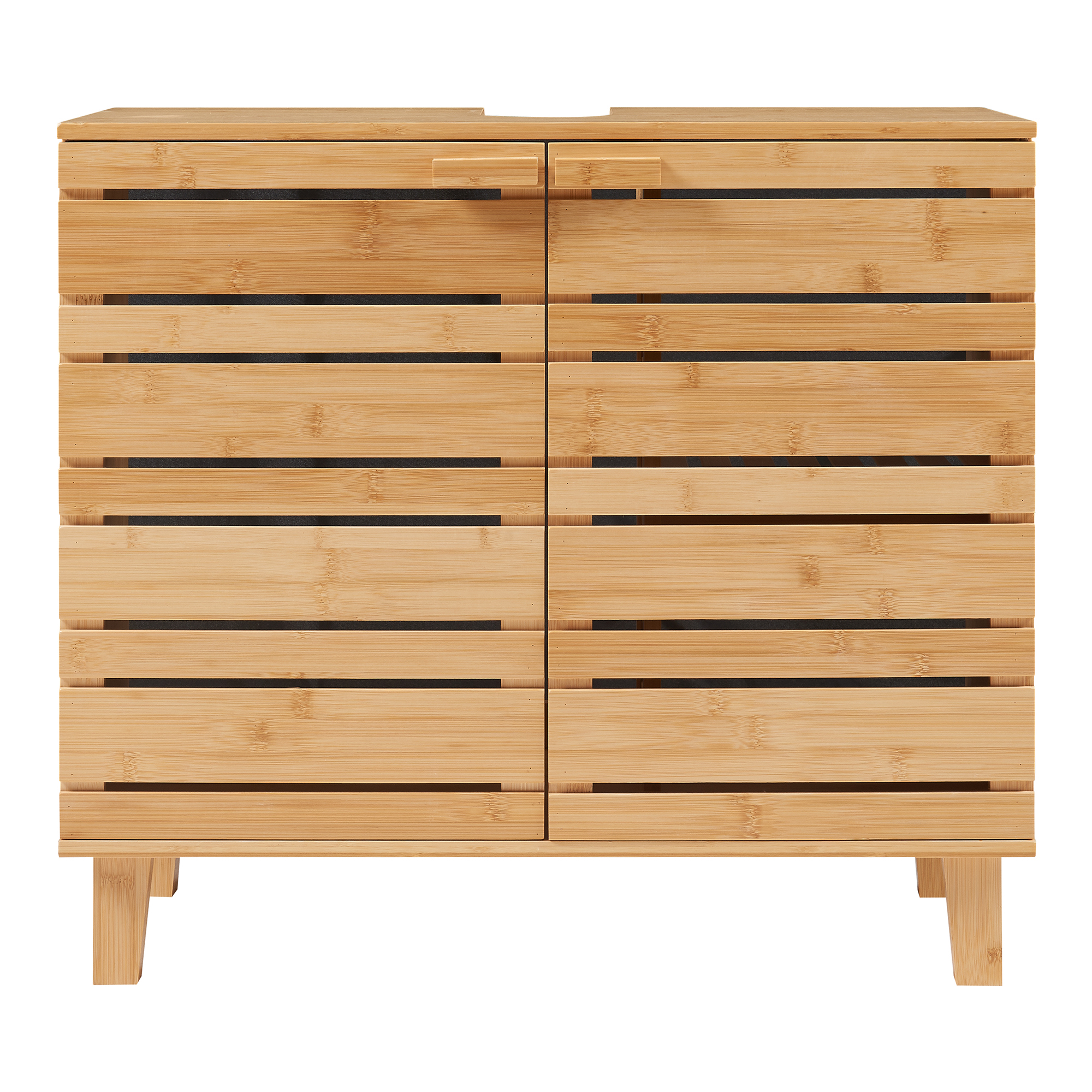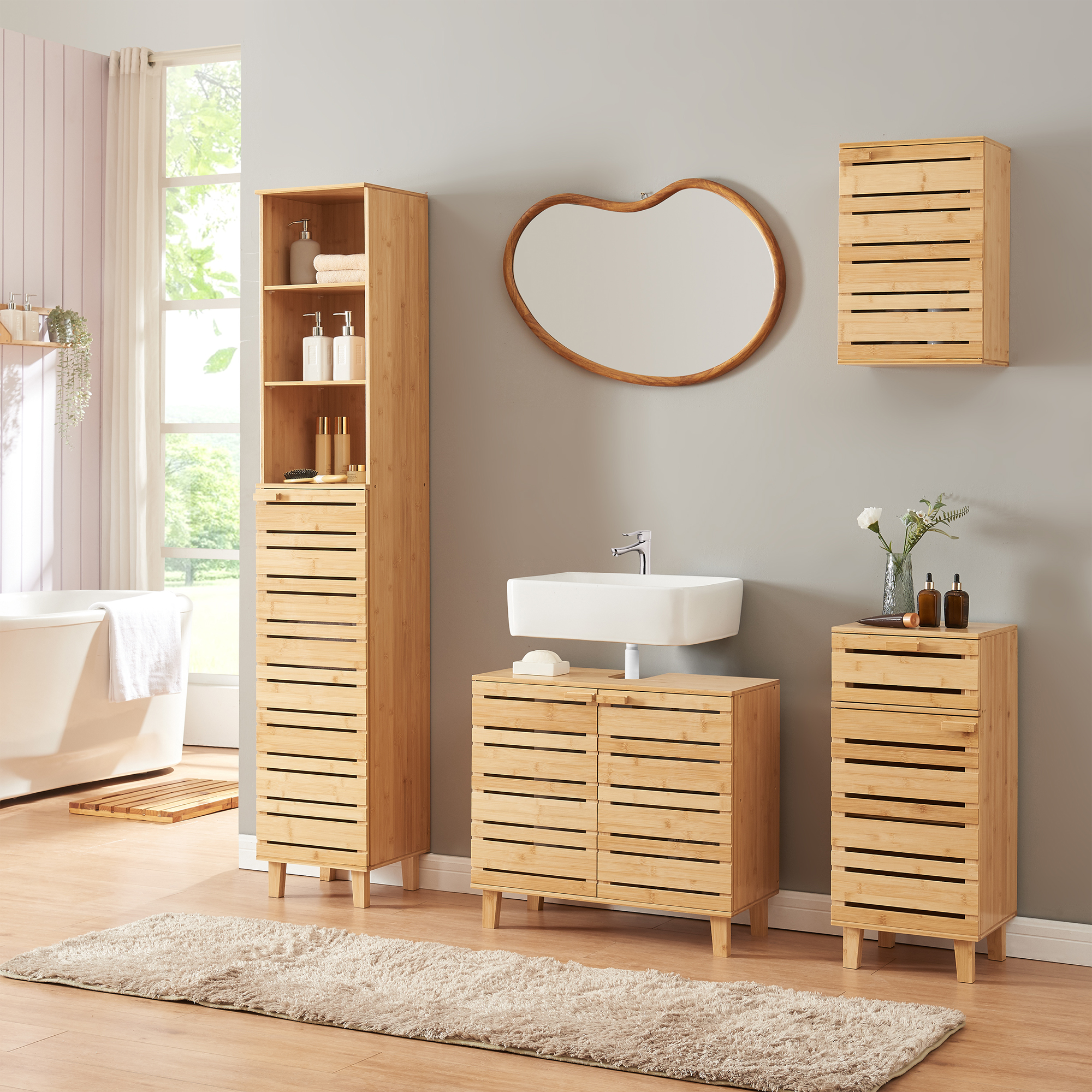 Acest dulap sub lavoar din bambus este o soluție practică și elegantă pentru organizarea eficientă a băii. Designul său natural, în nuanță caldă de lemn, se integrează ușor în decoruri moderne, scandinave sau clasice și ajută la valorificarea spațiului de sub chiuvetă.