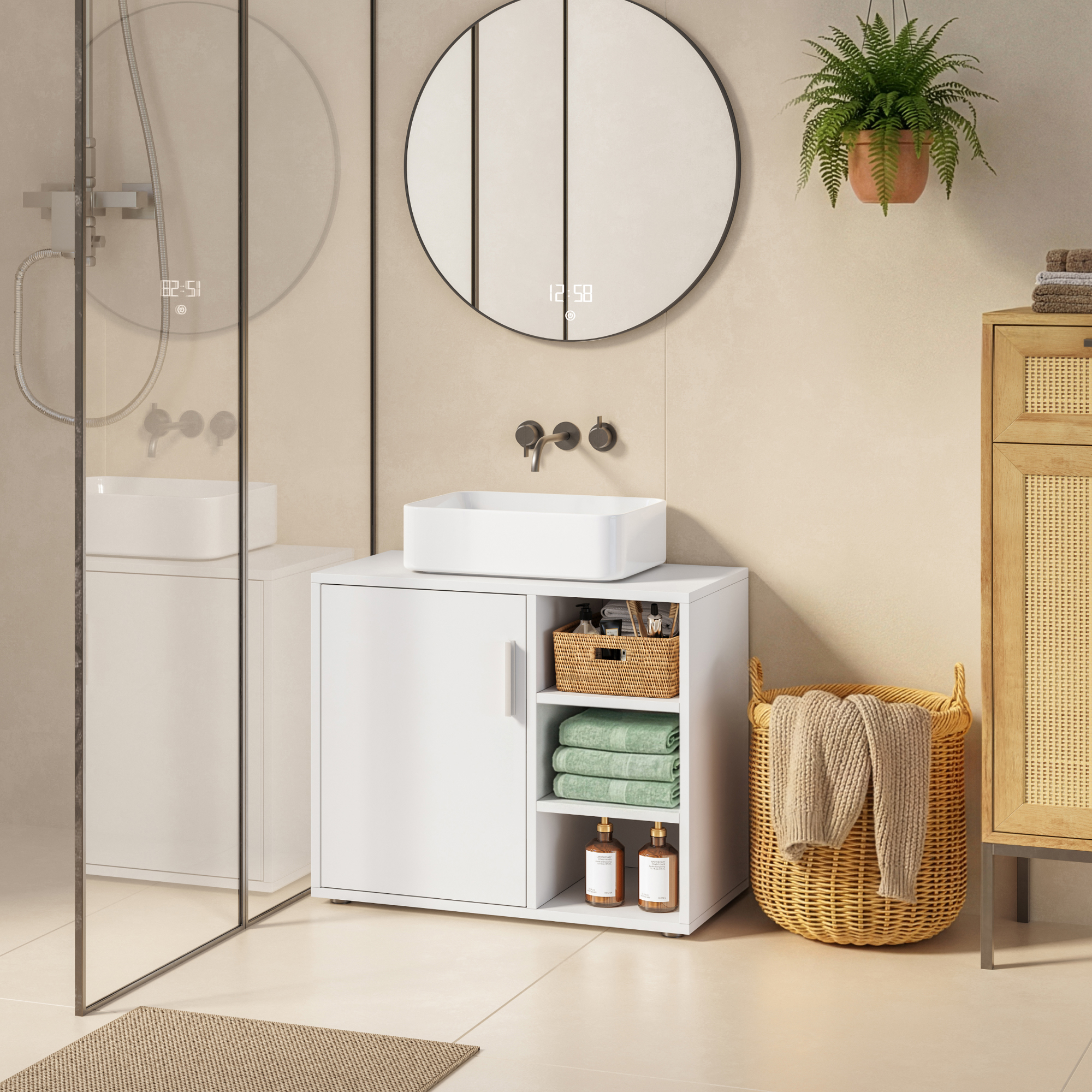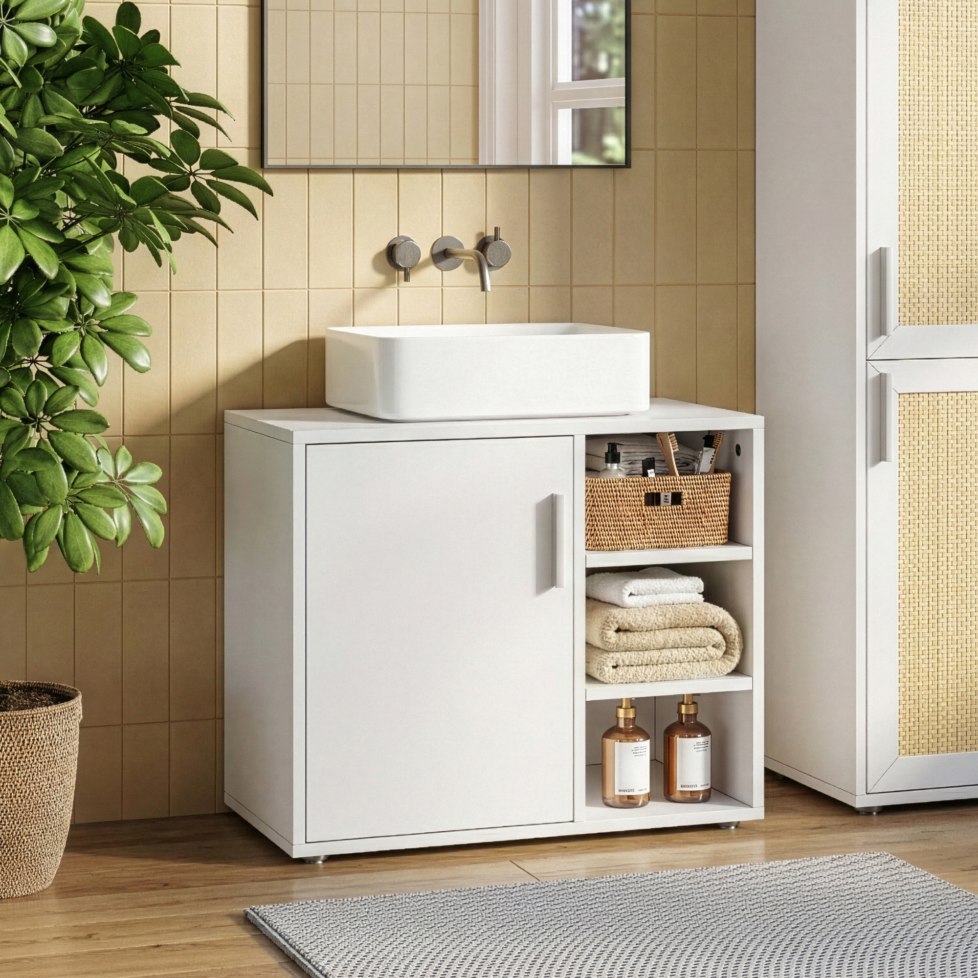 Usa cu maner confortabil si inchidere magnetica permite deschiderea si inchiderea usoara, iar cele 3 rafturi deschise din lateral sunt perfecte pentru cosmetice, perii, prosoape mici sau alte accesorii de baie. Este o alegere inspirata pentru o baie ordonata, dar si pentru spalatorie sau grup sanitar de serviciu.