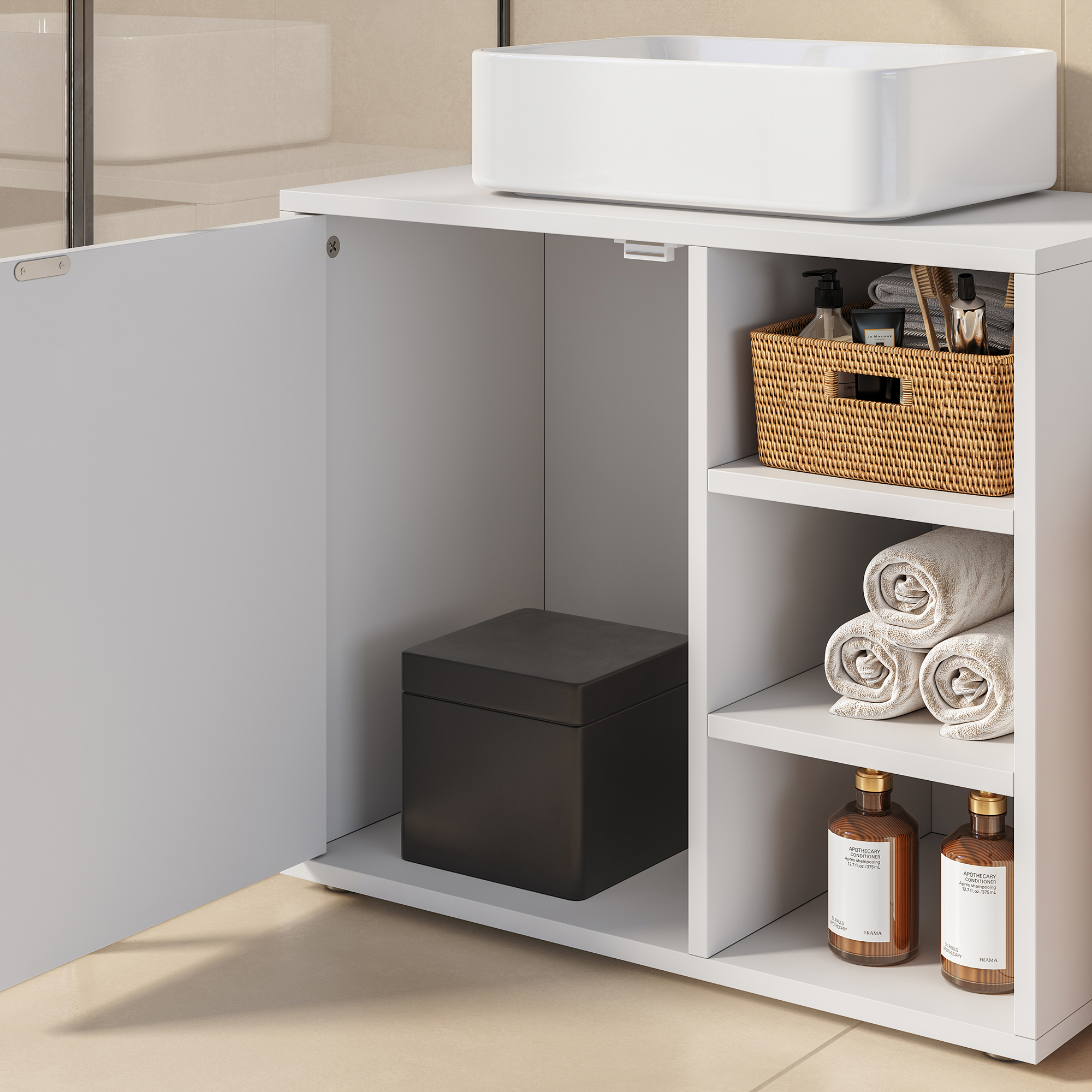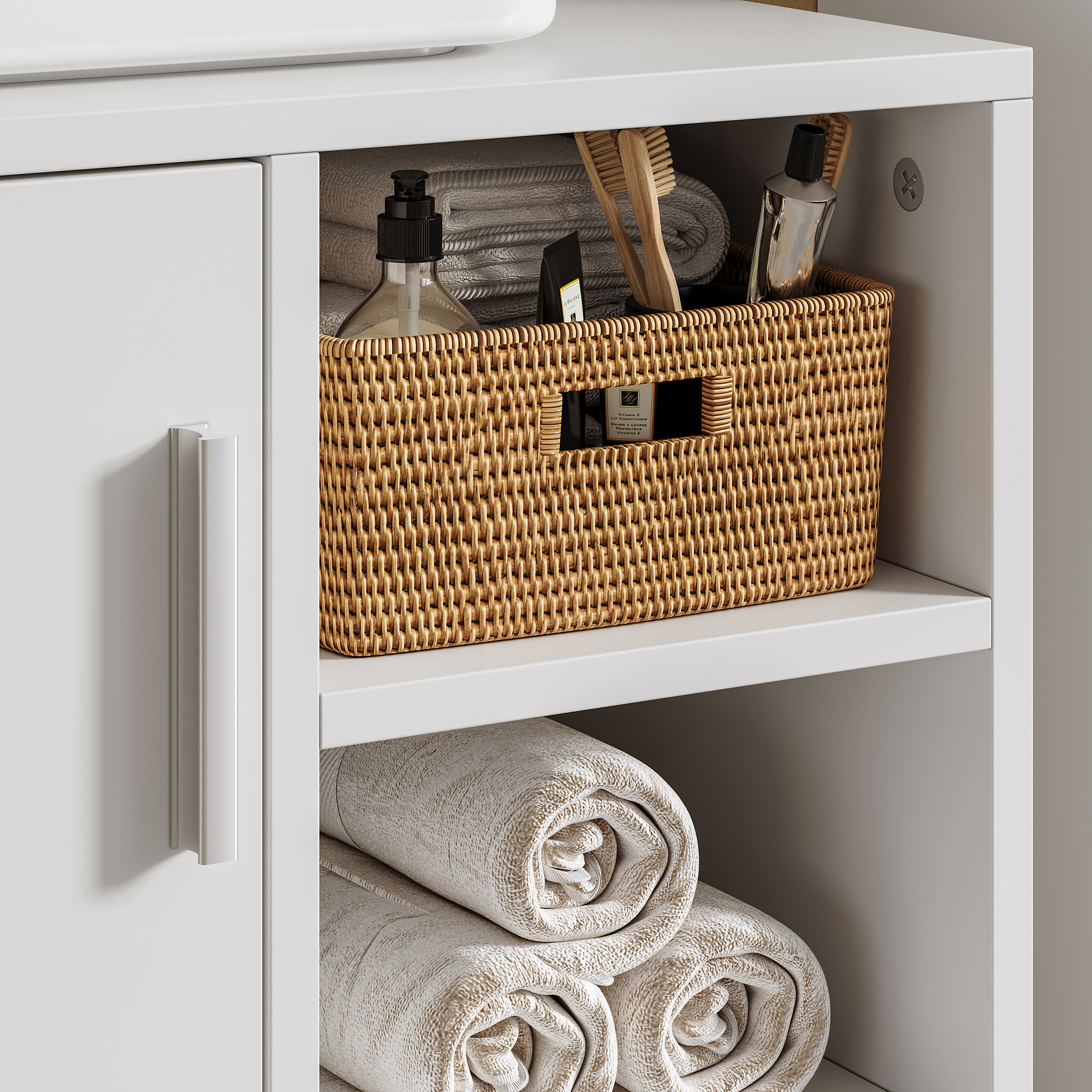 Acest corp baie cu rafturi este ideal pentru depozitarea cosmeticelor, produselor de ingrijire, aparatelor de ras, periutelor, prosoapelor sau accesoriilor mici. Compartimentele deschise te ajuta sa ai la indemana lucrurile folosite frecvent, iar spatiul inchis protejeaza obiectele pe care vrei sa le pastrezi discret.