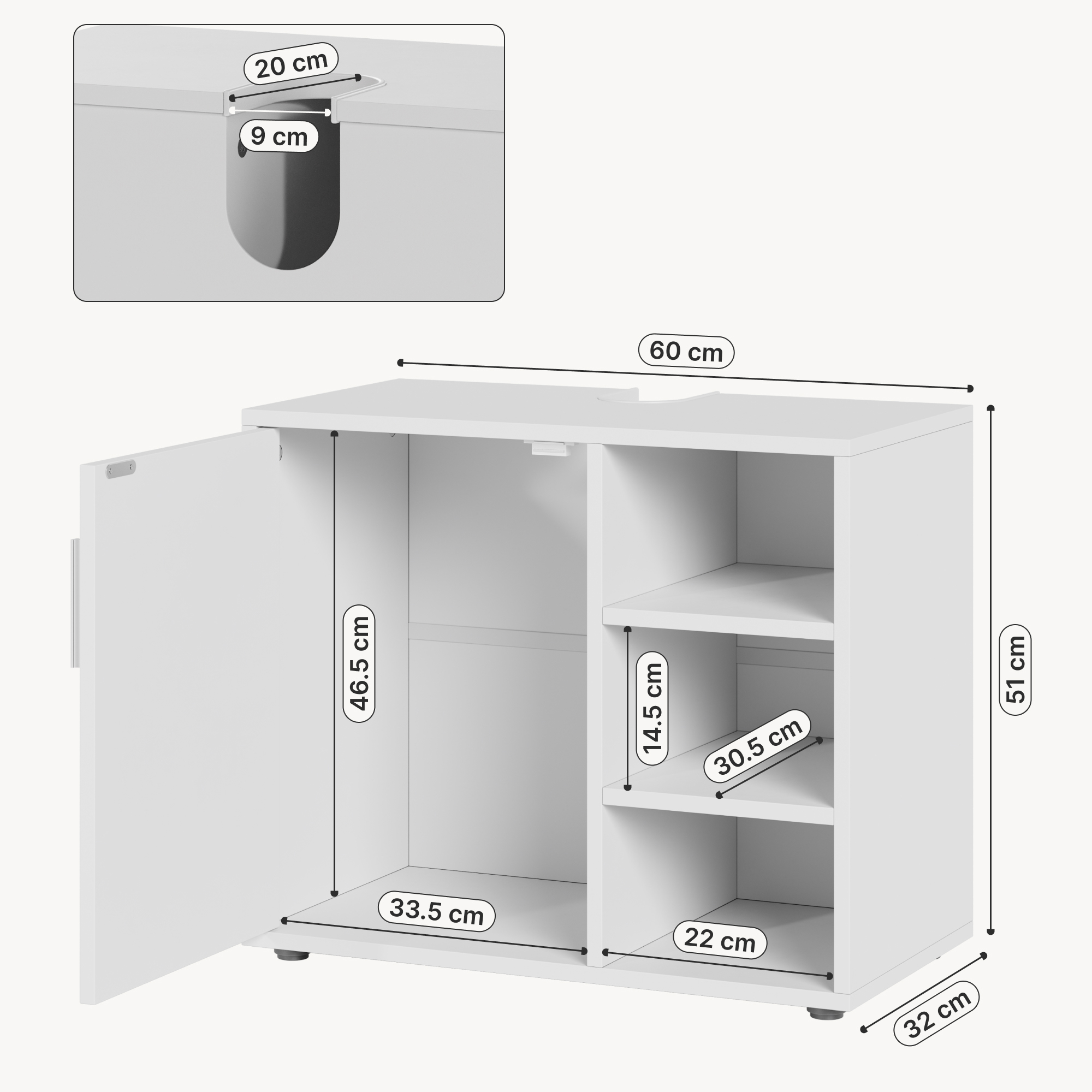 - Dulap baie sub lavoar cu decupaj pentru sifon, pentru montaj flexibil
