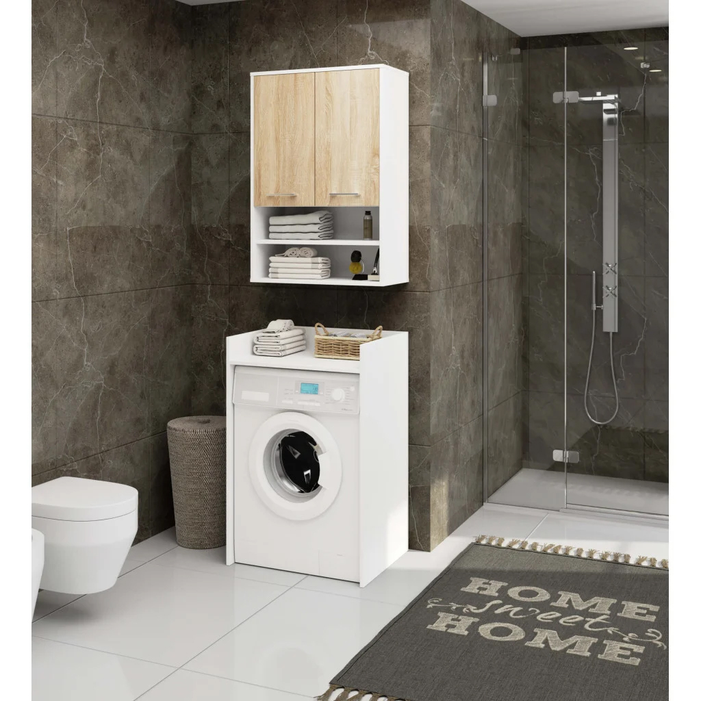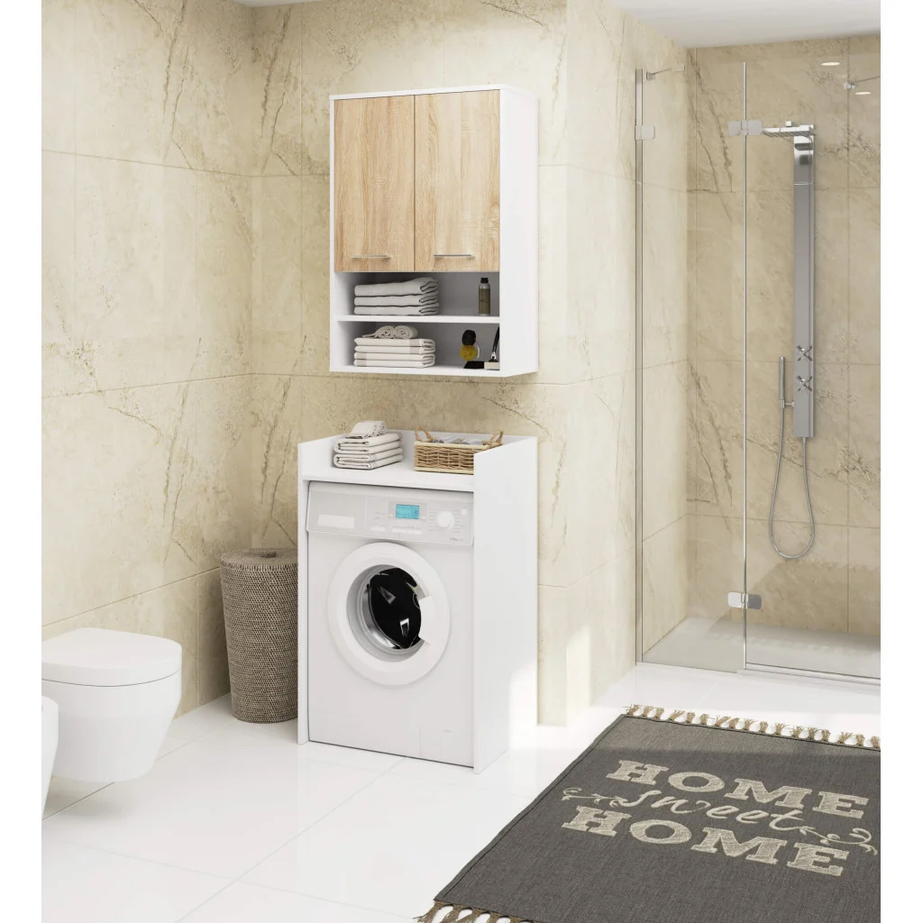 Dulap baie suspendat, cu 2 usi si 2 rafturi deschise, PAL 16 mm, 64x30x94 cm, alb si stejar sonoma Household NewTrend