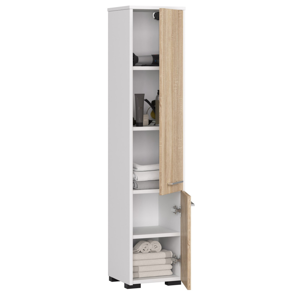 Dulap baie tip coloana cu 2 usi si 5 rafturi, PAL laminat, 30x30x140 cm, alb si stejar sonoma