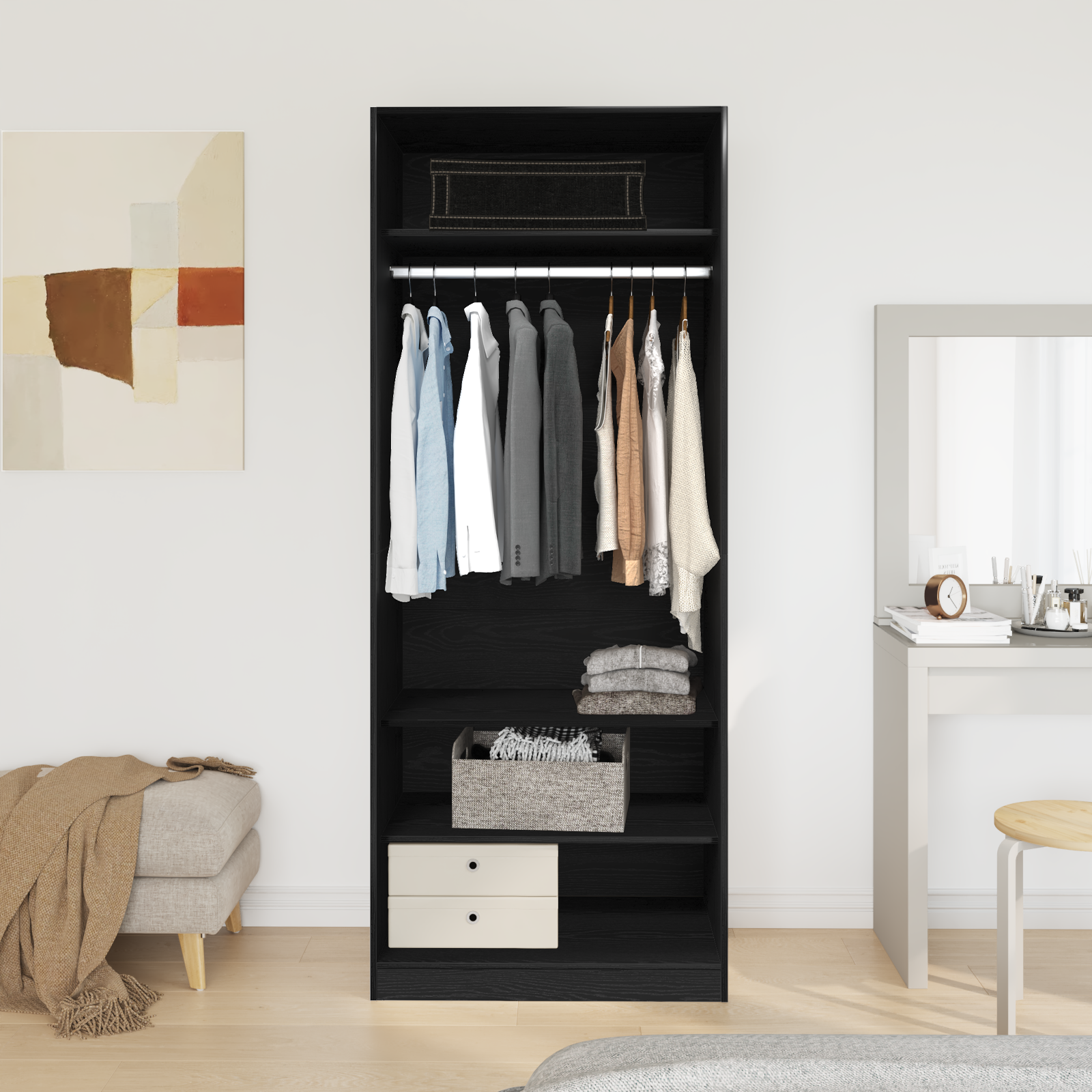 - Design liber Dulapul stă liber, deci îl poți poziționa oriunde în dormitor. Construirea sa permite fără suporturi pentru pereți, oferind o soluție flexibilă pentru orice aranjament de cameră.