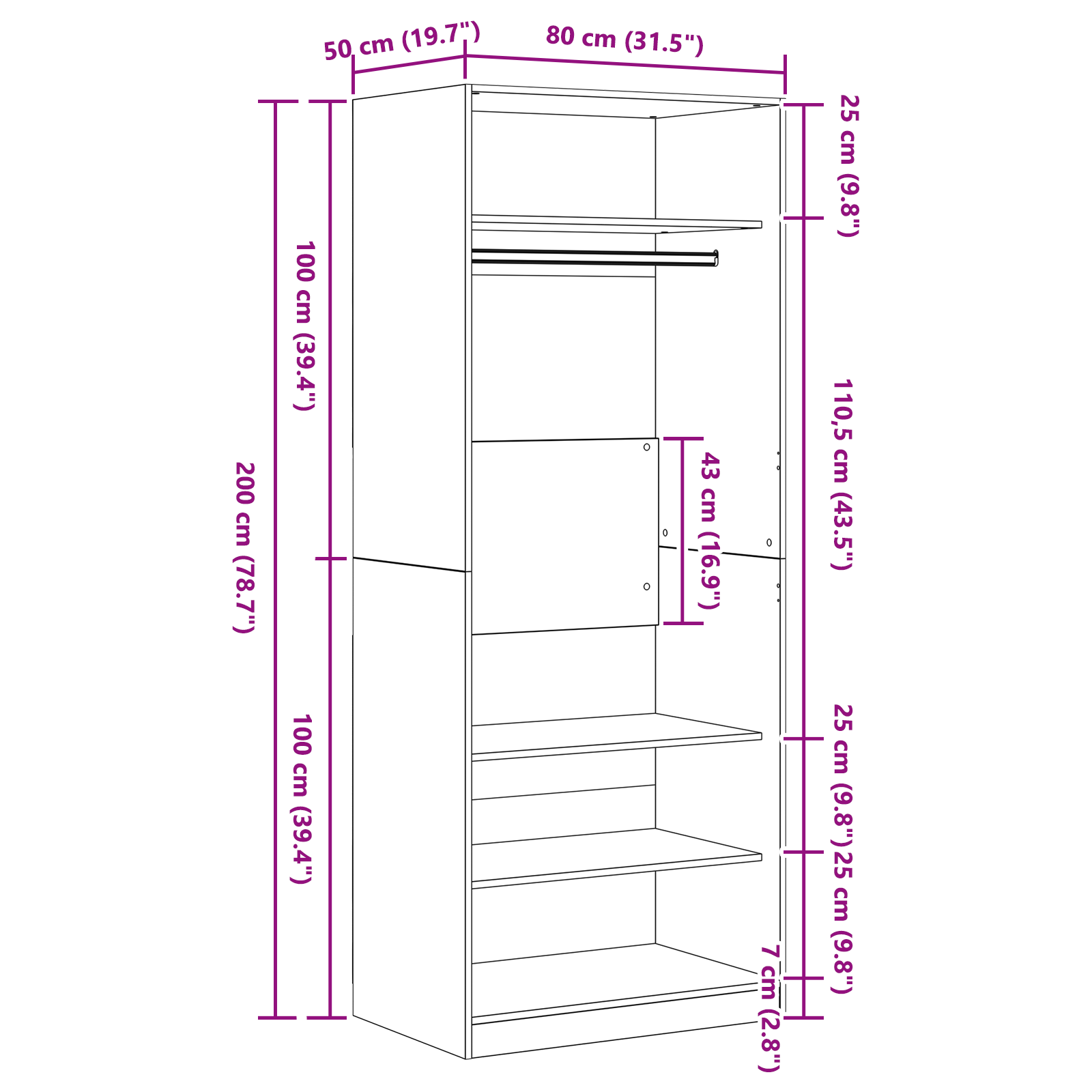 - Dimensiuni generale: 80 x 50 x 200 cm (L x l x î)