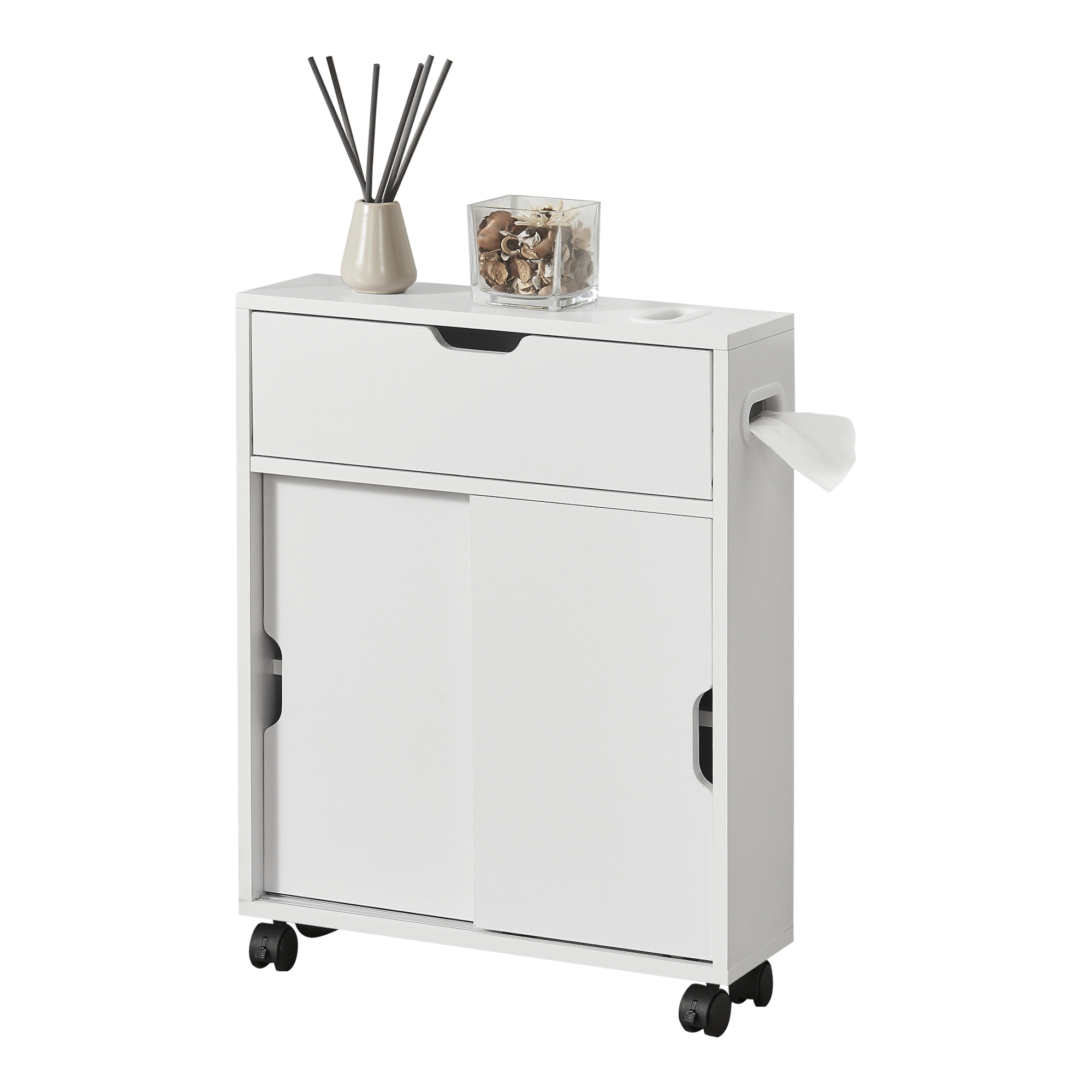 Dulap de baie îngust Kempele cu roți și uși glisante, alb, 67x52x17 cm