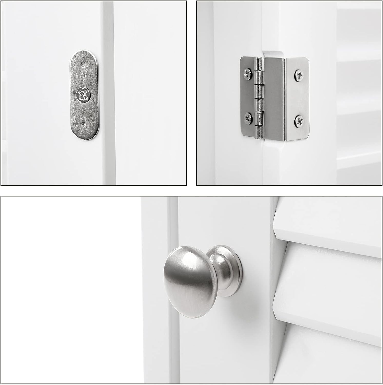 Modelul include un sertar practic și două compartimente ascunse în spatele ușii, fiind ideal pentru produse de igienă, prosoape mici, cosmetice sau alte accesorii de uz zilnic. Suprafața este ușor de curățat, iar panourile solide din MDF contribuie la o utilizare durabilă. Pentru un plus de siguranță, dulapul poate fi fixat de perete cu sistemul anti-răsturnare inclus.
