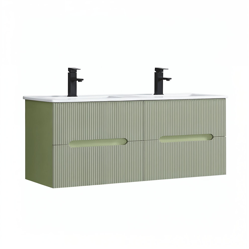 Dulapul de baie suspendat Leziter Trent 120 cm este o alegere inspirată pentru o baie modernă și ușor de întreținut. Combinația dintre frontul striat în nuanță verde fistic-oliv și chiuveta ceramică albă oferă un aspect proaspăt, iar montajul pe perete eliberează vizual spațiul și simplifică curățenia.