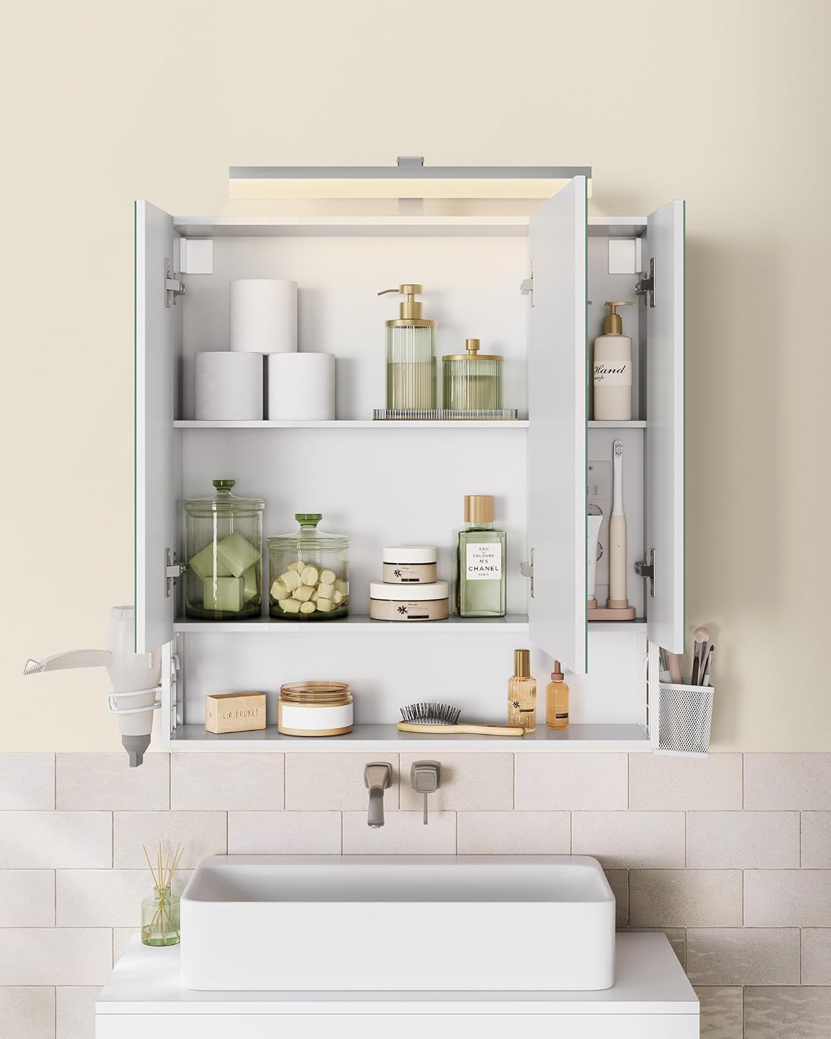 - Accesorii incluse: suport uscător de păr, coș suspendat