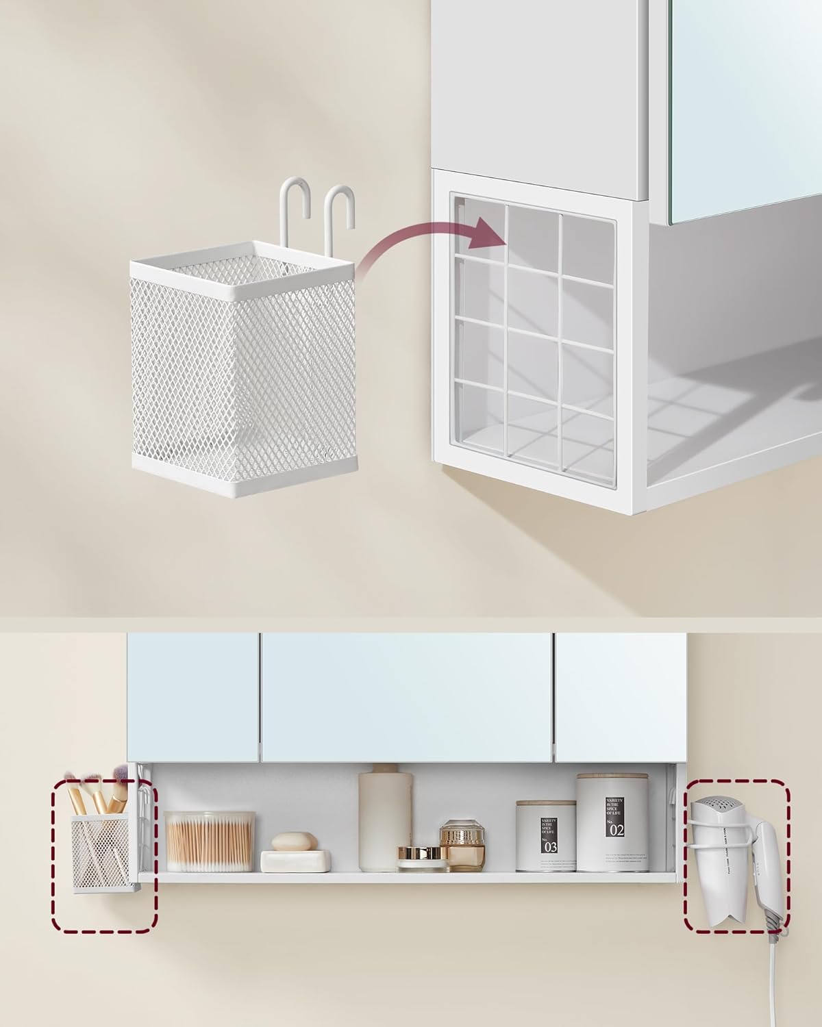 Acest dulap baie cu oglindă oferă spații variate pentru organizarea cosmeticelor, produselor de igienă și accesoriilor utile. Compartimentul deschis este practic pentru obiectele folosite frecvent, iar dulapul cu uși păstrează un aspect ordonat și curat. În plus, suportul pentru uscătorul de păr și coșul suspendat completează un ansamblu gândit pentru eficiență maximă.