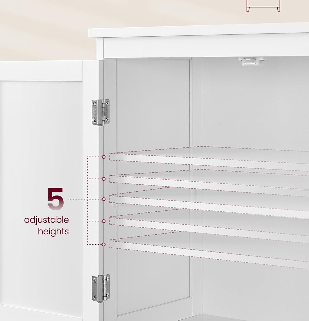 Modelul este prevazut cu 2 sertare spatioase si un compartiment superior cu 2 usi, perfect pentru depozitarea accesoriilor de baie, a uscatorului de par, a produselor de ingrijire sau a articolelor de curatenie. In plus, raftul reglabil pe 5 niveluri iti permite sa adaptezi spatiul interior in functie de obiectele depozitate.