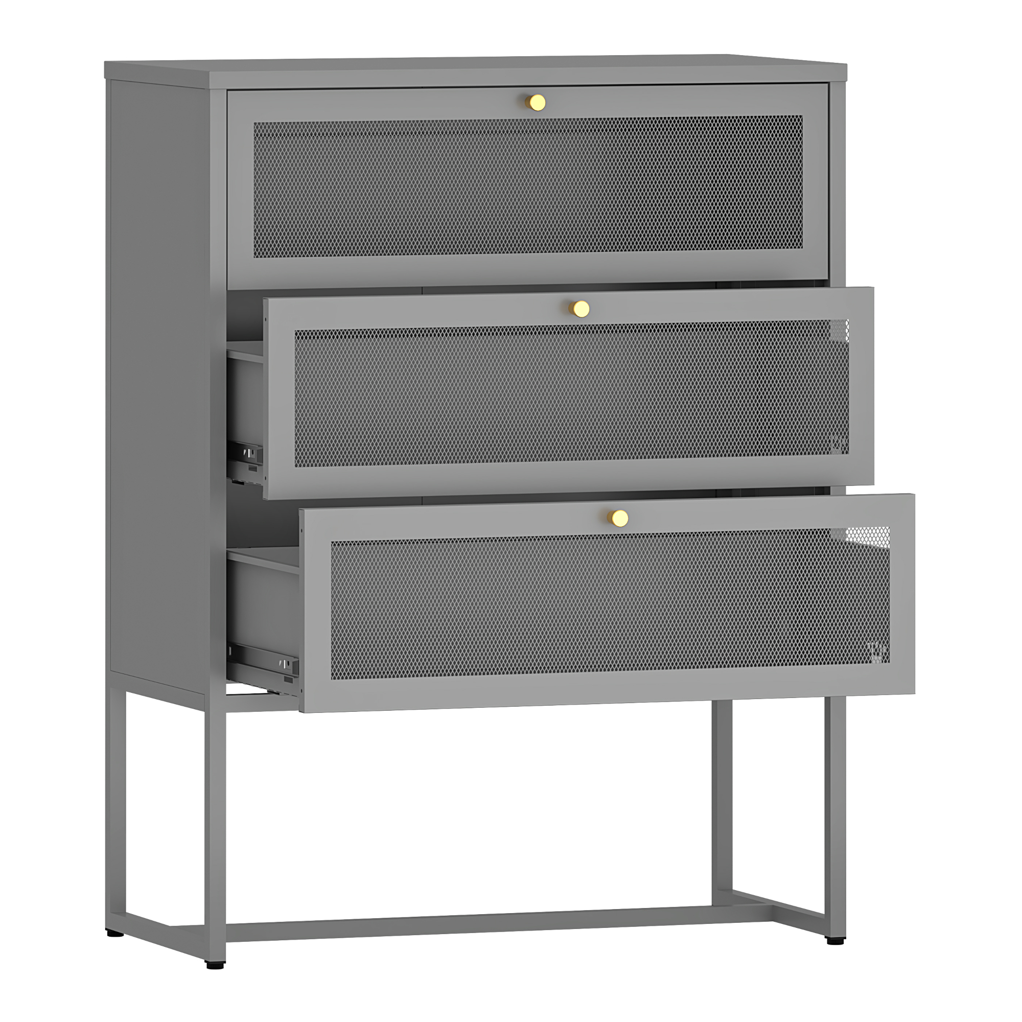 Cele trei sertare incapatoare ofera suficient spatiu pentru depozitare ordonata, iar fronturile din plasa metalica fina contribuie la o ventilatie optima si la un aspect contemporan. Manerele discrete permit deschiderea usoara, iar suprafata este simplu de intretinut, pentru un plus de confort in utilizarea zilnica.