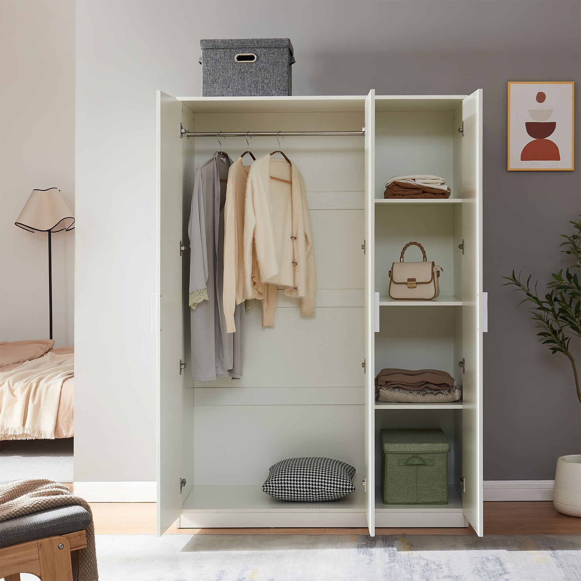 Prevăzut cu 3 uși, o bară pentru haine și 4 rafturi interioare, dulapul oferă un spațiu generos și bine compartimentat. Poți păstra hainele pe umerașe în zona înaltă și poți organiza separat textile, cutii, genți sau alte obiecte pe rafturile laterale.