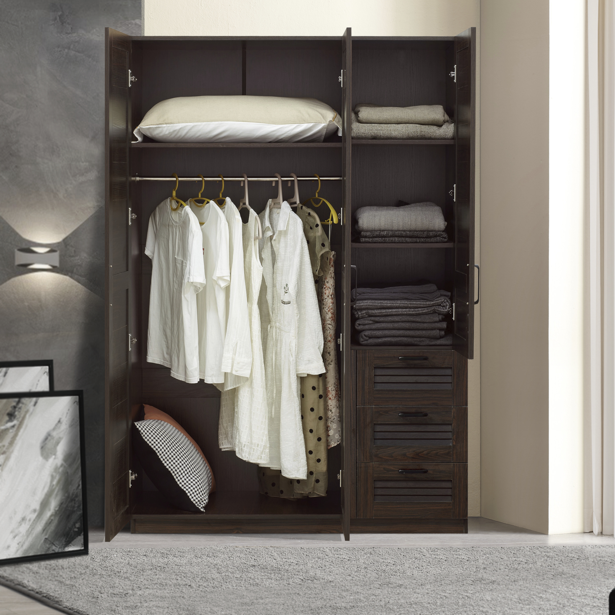Poate fi folosit ca șifonier principal în dormitor sau ca soluție suplimentară de depozitare pentru haine împăturite, articole suspendate, lenjerii, cutii organizatoare și accesorii. Compartimentarea oferă flexibilitate pentru utilizarea zilnică într-un spațiu bine ordonat.